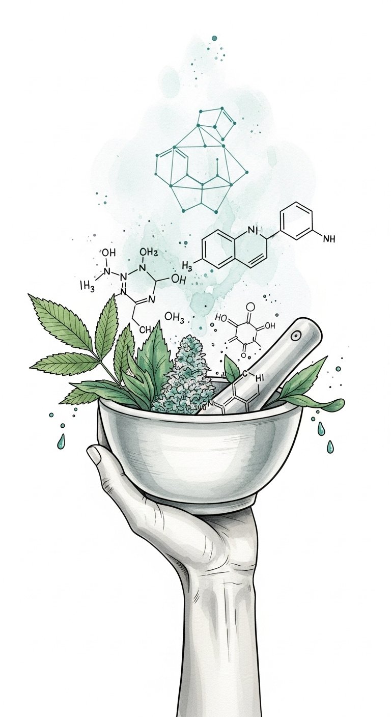 The design symbolizes the careful balance between natural ingredients and scientific precision—botanical leaves for compatibility, molecular diagrams for active components, and geometric stability patterns representing formulation integrity.