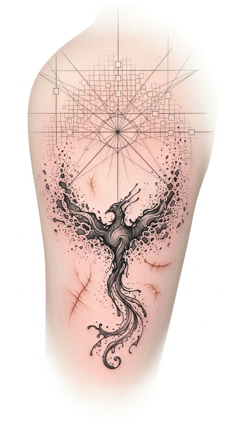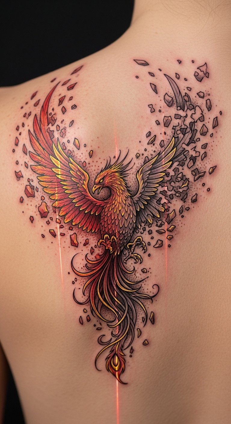 The phoenix rising from scattered ink fragments symbolizes transformation and reclamation of the body; the warm colors shifting to soft grays reflect the transition from old identity to renewed skin, while the fragmented ink and laser-like highlights evoke the process of removal and healing.