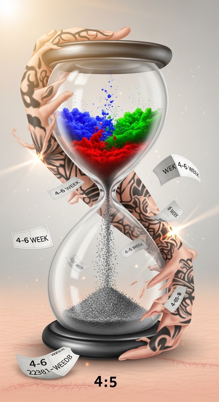 This design symbolizes the passage of time and gradual transformation: the hourglass denotes measured intervals and patience, the colorful ink dissolving into gray represents fading pigments and the complexity of different ink colors, while the fluttering calendar pages echo the recommended 4–10 week session spacing.