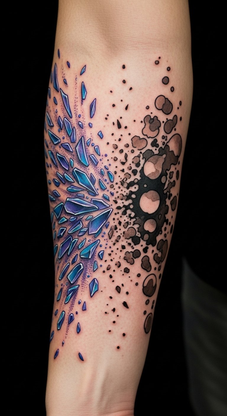 This concept uses the left micro-shards to symbolize the precision and rapid action of picosecond technology—energetic, clean, and clinical—while the right blotches embody the steadier, cumulative process of nanosecond treatment. The dissolving center represents the gradual transformation and choices involved in removal, evoking feelings of change, patience, and renewal. Ideal placement along the outer forearm or calf allows the linear transition to follow muscle lines and be visible during both motion and rest, turning a technical comparison into a personal narrative about transformation and fresh starts.
