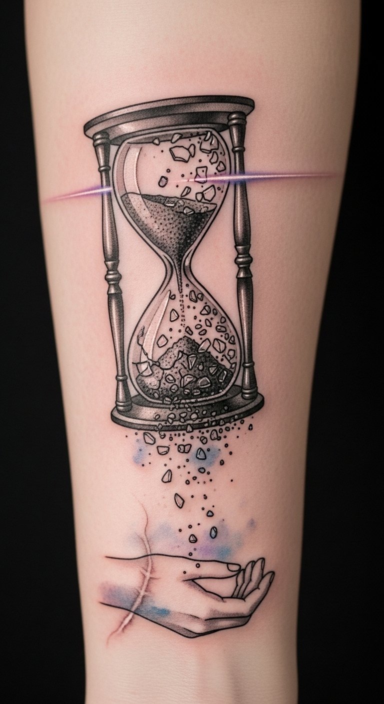 Emotionally it balances hope and realism—acknowledging that removal is a process rather than instant—making it suitable for forearm or rib placement where the elongated hourglass can follow natural contours and be covered or revealed as desired.