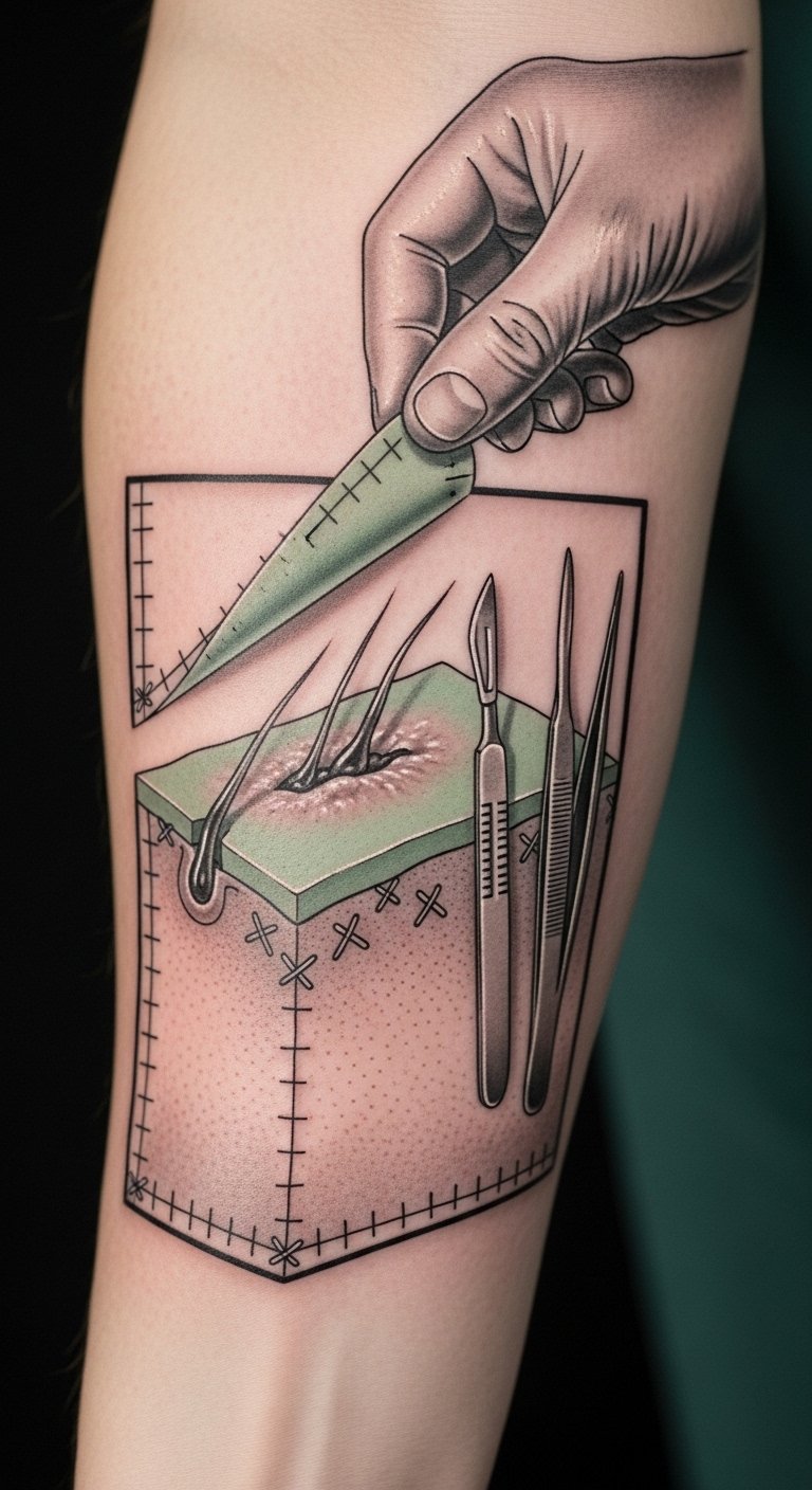 The excision benefits include minimal treatment sessions and precise targeting, making it an appealing choice for those seeking a clean slate without the hassle of ongoing treatments. The design symbolizes deliberate transformation and controlled renewal—the lifted skin reveals what comes after letting go, while the instruments and sutures suggest care, precision, and intentionality; emotionally it balances relief and resolve, suited for inner forearm or upper arm placement where the act of concealment and revelation can be seen intimately yet shown selectively.