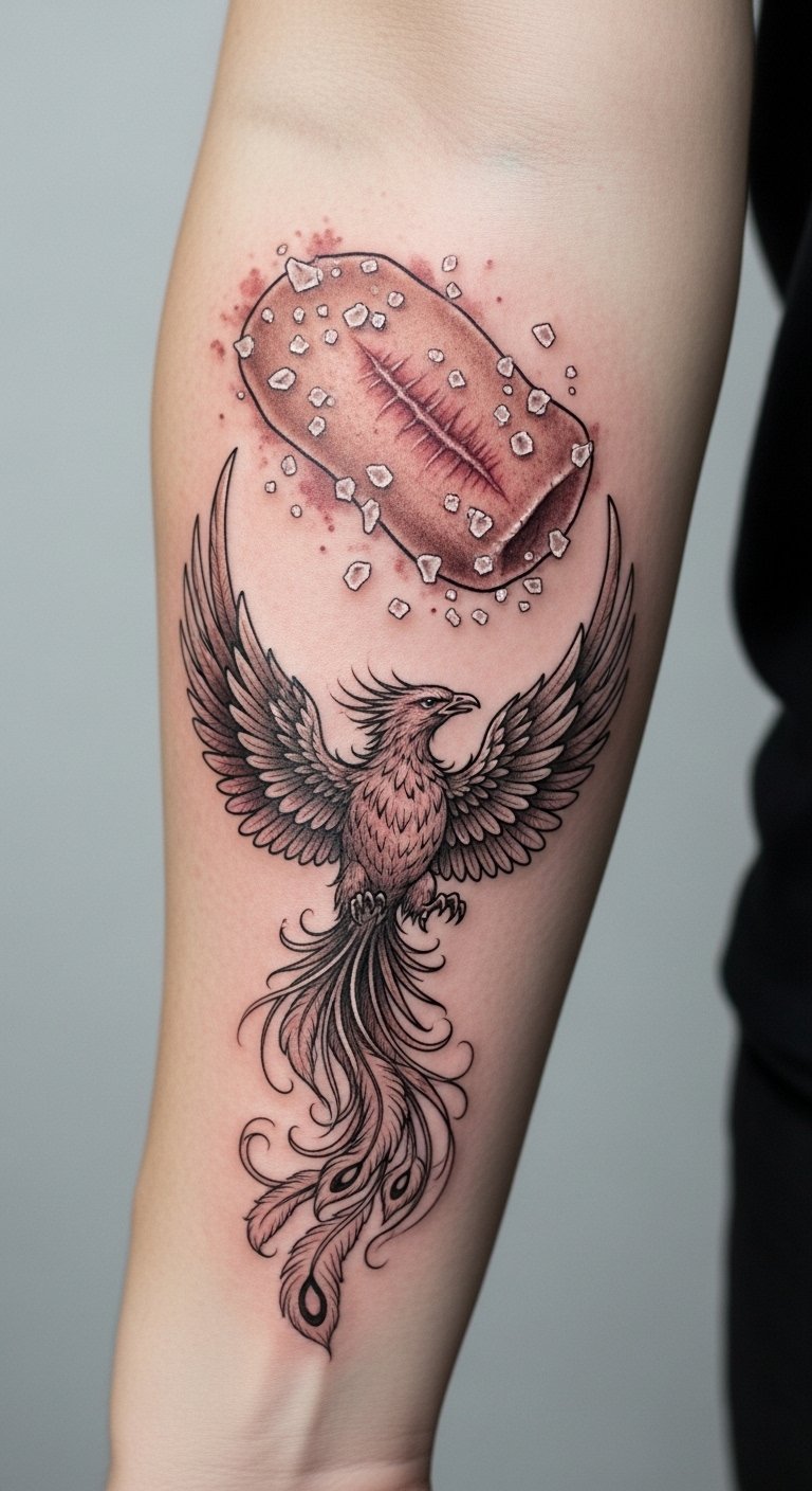 It’s essential to weigh the potential salabrasion pain against your desire for a fresh start when considering this option. The design uses the salt-scrubbed skin morphing into a phoenix to symbolize painful transformation and rebirth: the salt crystals and scars signify the hurt endured, while the phoenix emerging beneath represents resilience and renewal.