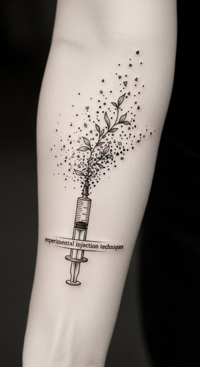 The design symbolizes transition and hope: the syringe represents scientific intervention and the vine signifies natural regeneration, while the dissolving particles portray the fading of old marks and memories.
