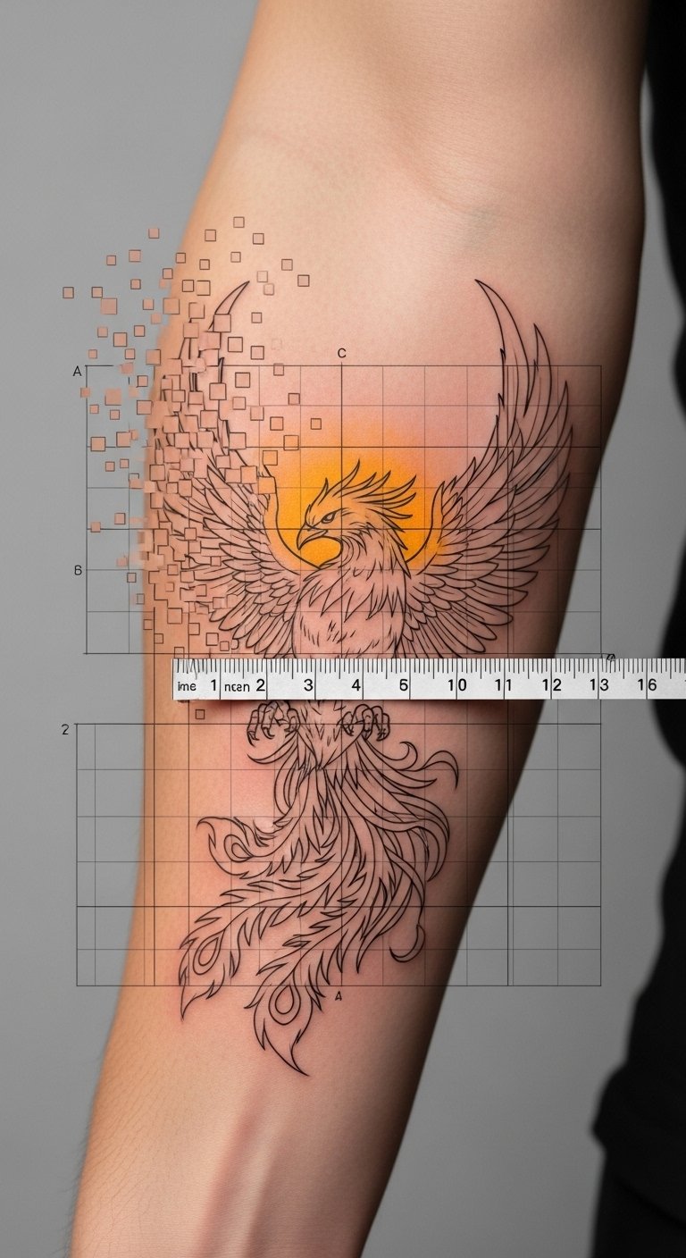 The design symbolizes transformation and the decision-making process: the phoenix represents rebirth and the desire to reclaim or renew, while the pixelated fading side and measuring tape acknowledge practical considerations like size affecting removal options.