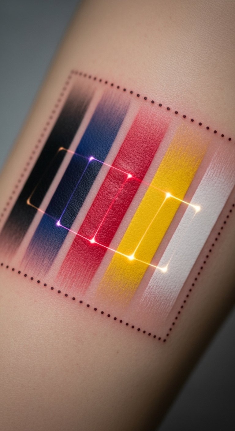 This design uses the original text as thematic inspiration: the palette and fading pixels symbolize how different ink colors respond to removal, the laser streaks represent treatment techniques cutting through darker tones, and the floral tendrils soften the technical imagery to convey renewal and care. Emotionally it balances clinical precision with hope—acknowledging challenge while suggesting a fresh start. Ideal placement is the outer upper arm or shoulder where medium size allows clear color detail and room for future expansion or alteration.