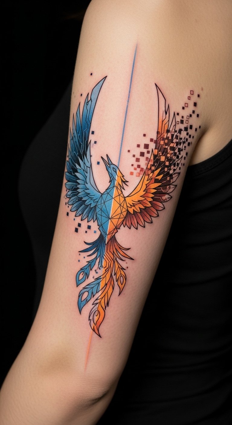 A phoenix made from laser-like geometry and dissolving ink symbolizes technological removal and personal rebirth: the sharp lines and circuitry hint at advanced systems, while the fading patches and pixelated wing tips represent non-invasive methods and the transition from past to fresh canvas.