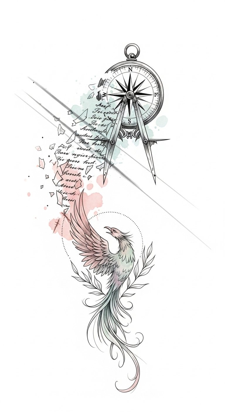 The design uses the compass as guidance and the phoenix as rebirth to symbolize navigating toward renewal; watercolor fades and gray streaks visually echo removal and healing, while script fragments represent fragments of past identity gently dissolving.