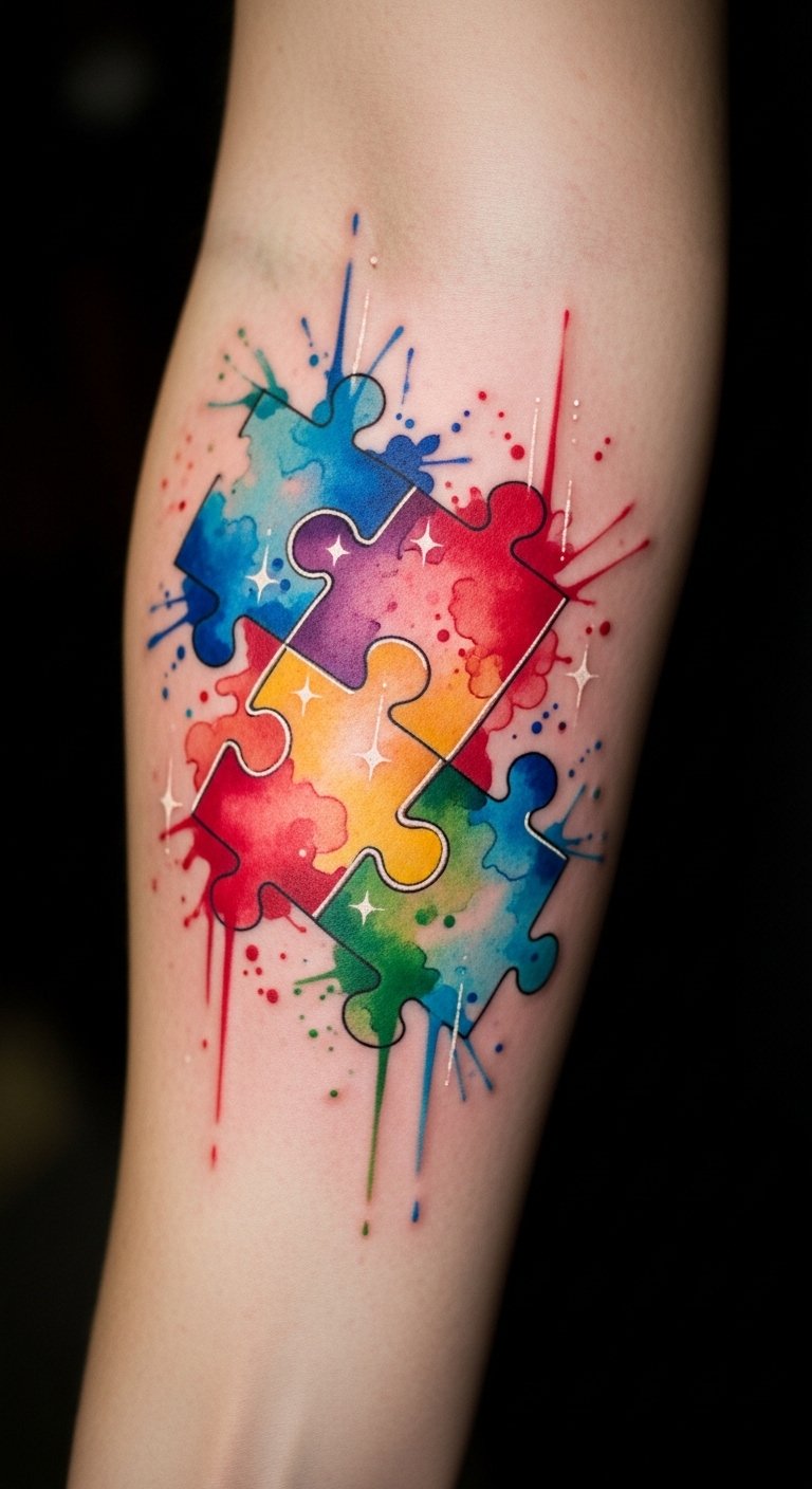 Using watercolor techniques, these tattoos bring a splash of color and creativity to the traditional puzzle piece symbol.