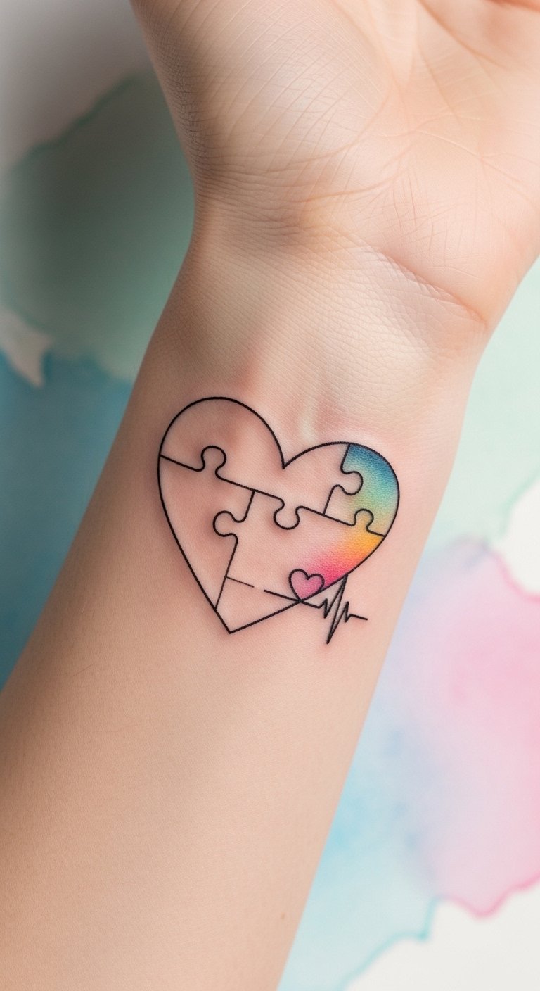 A heart-shaped puzzle piece tattoo beautifully merges two powerful symbols of love and individuality, making it an inspiring choice for those wishing to express their support for autism awareness.