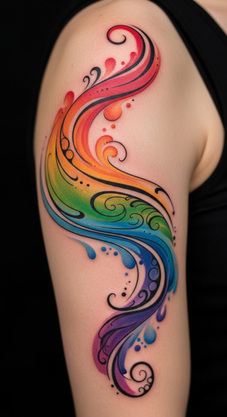 This design places a flowing, ribbon-like wash of blended colors—soft blues, warm magentas, sunlit yellows, and verdant greens—across the outer forearm or along the collarbone, with feathery edges and subtle splatters to mimic brushstrokes. Symbolically the spectrum represents diversity of thought and experience; the abstract flow conveys movement, growth, and the ongoing nature of personal identity. Emotionally it evokes joy, acceptance, and creative freedom; the placement allows visibility when you wish to share the message, yet can be easily covered, offering both pride and privacy.
