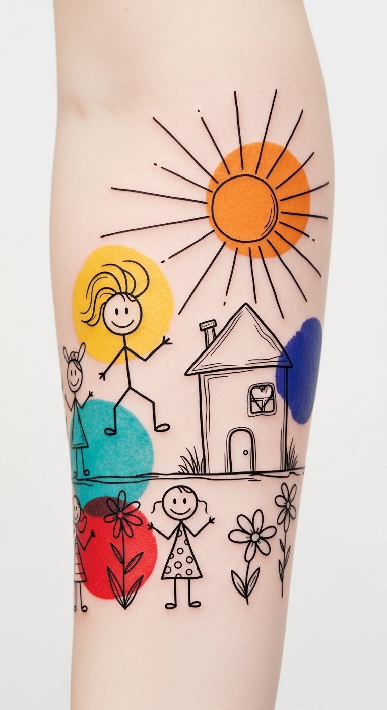 A child’s drawing can capture pure imagination and unfiltered emotion, making it an extraordinary choice for a tattoo. This childhood art transforms personal experiences into meaningful expression, celebrating your unique bond.