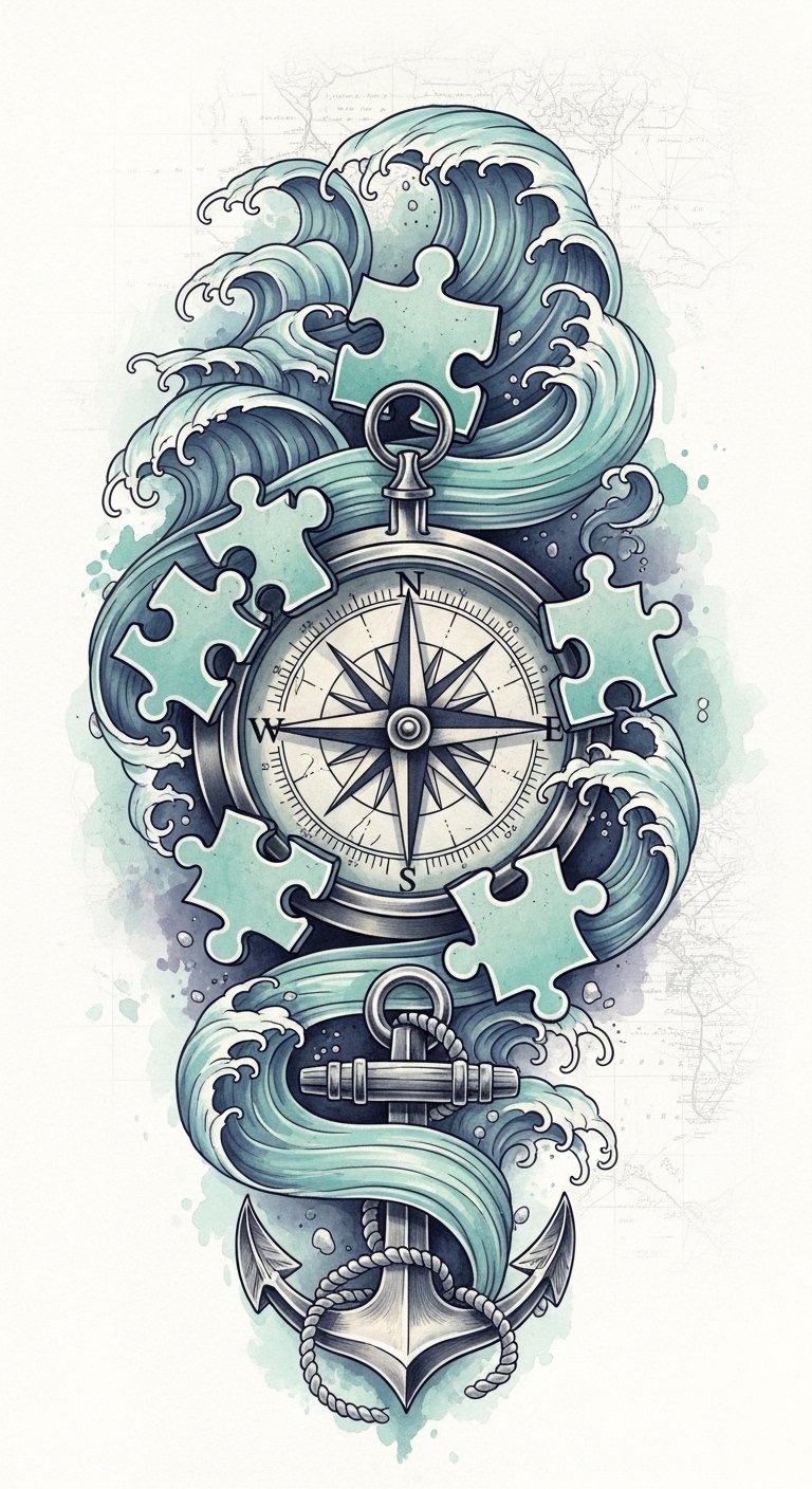 Steering through life can feel much like a journey at sea, where a nautical theme tattoo featuring a compass intertwined with puzzle pieces symbolizes guidance and unity in the autism community.