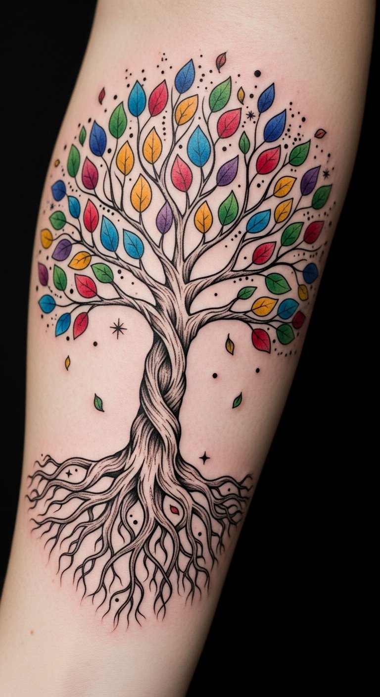Embracing the journey of life, a Tree of Life tattoo adorned with colorful leaves symbolizes growth, strength, and connection within the autism community. This vibrant design reflects your personal growth and family roots, inspired by nature’s beauty.