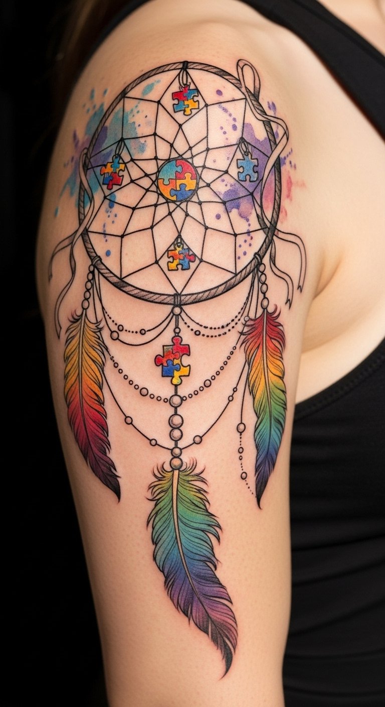 Dreamcatcher symbolism represents protection and the filtering of negativity, while autism representation highlights your unique journey. This tattoo celebrates individuality, reminding you that your differences are your strength, woven into a tapestry of color, love, and resilience.