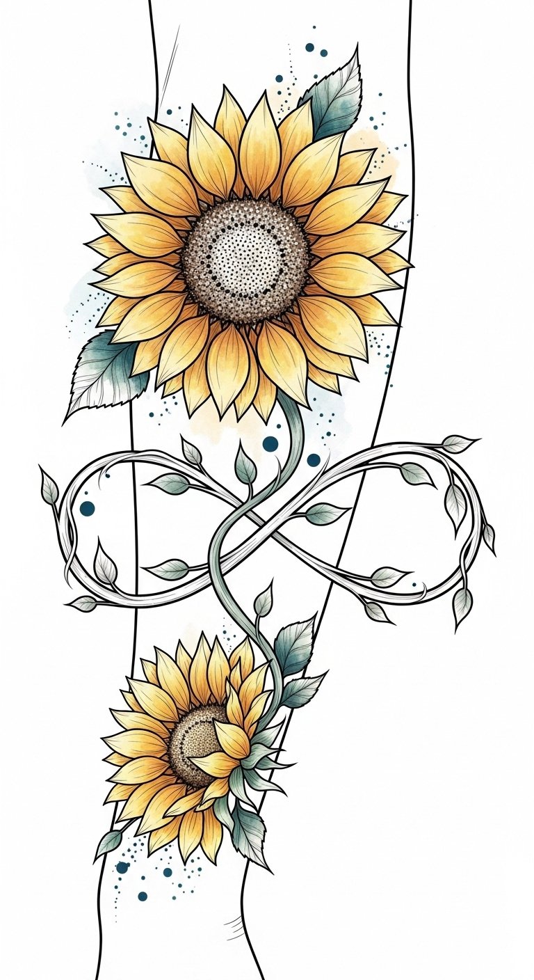 Together, they celebrate the unique journey of those on the spectrum, reminding you that every moment is a beautiful part of a continuous story. Place the tattoo on the forearm or upper arm to allow the vine-like infinity to flow naturally with the arm’s contours; the warm yellows and subtle teal accents evoke optimism and calm, while the combination of bold outlines and soft watercolor shading balances permanence with gentle emotion.
