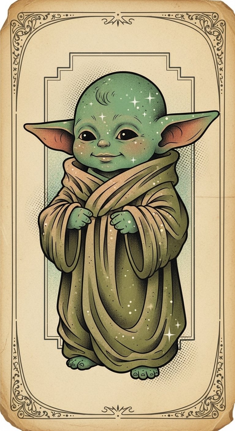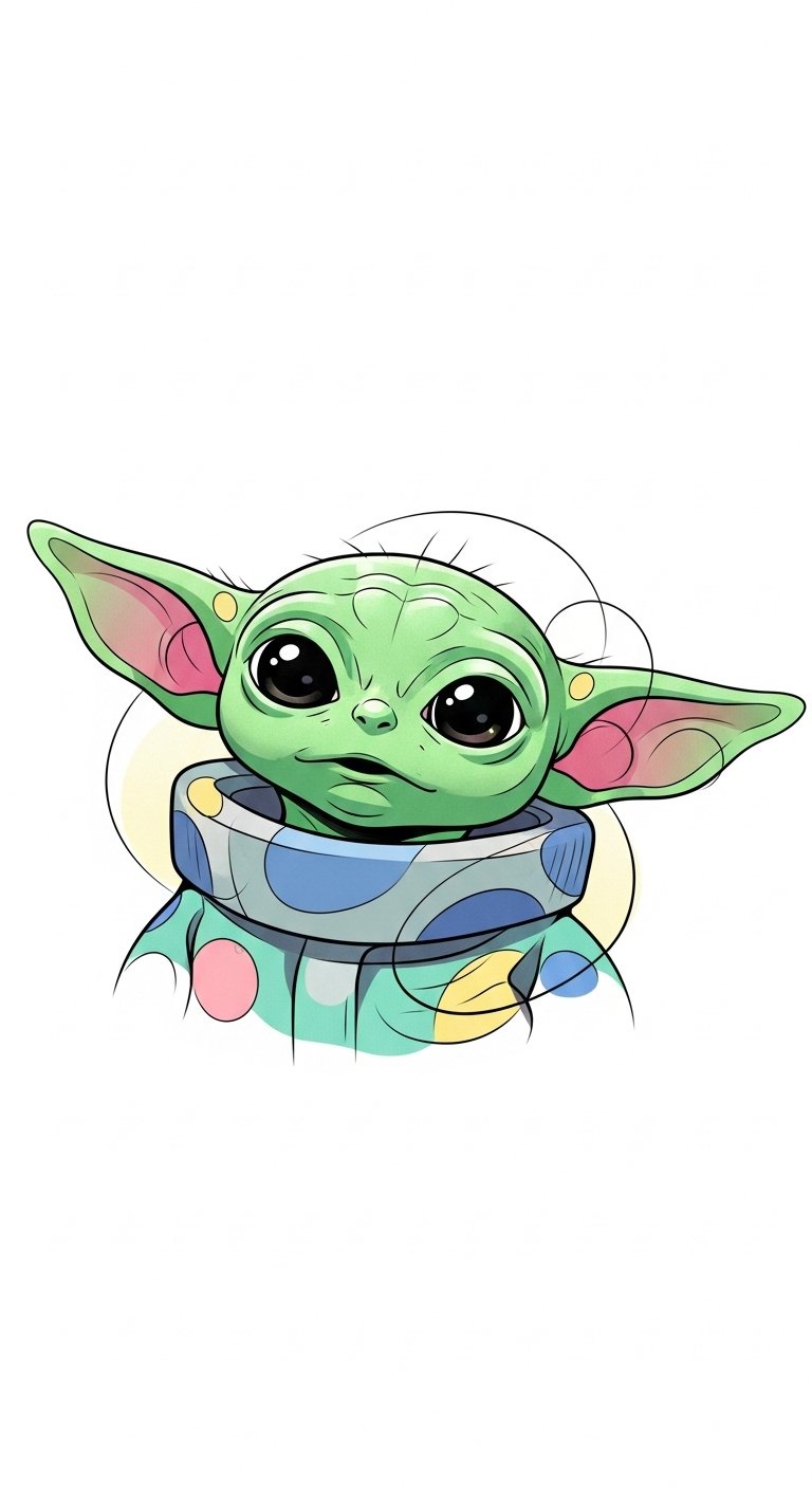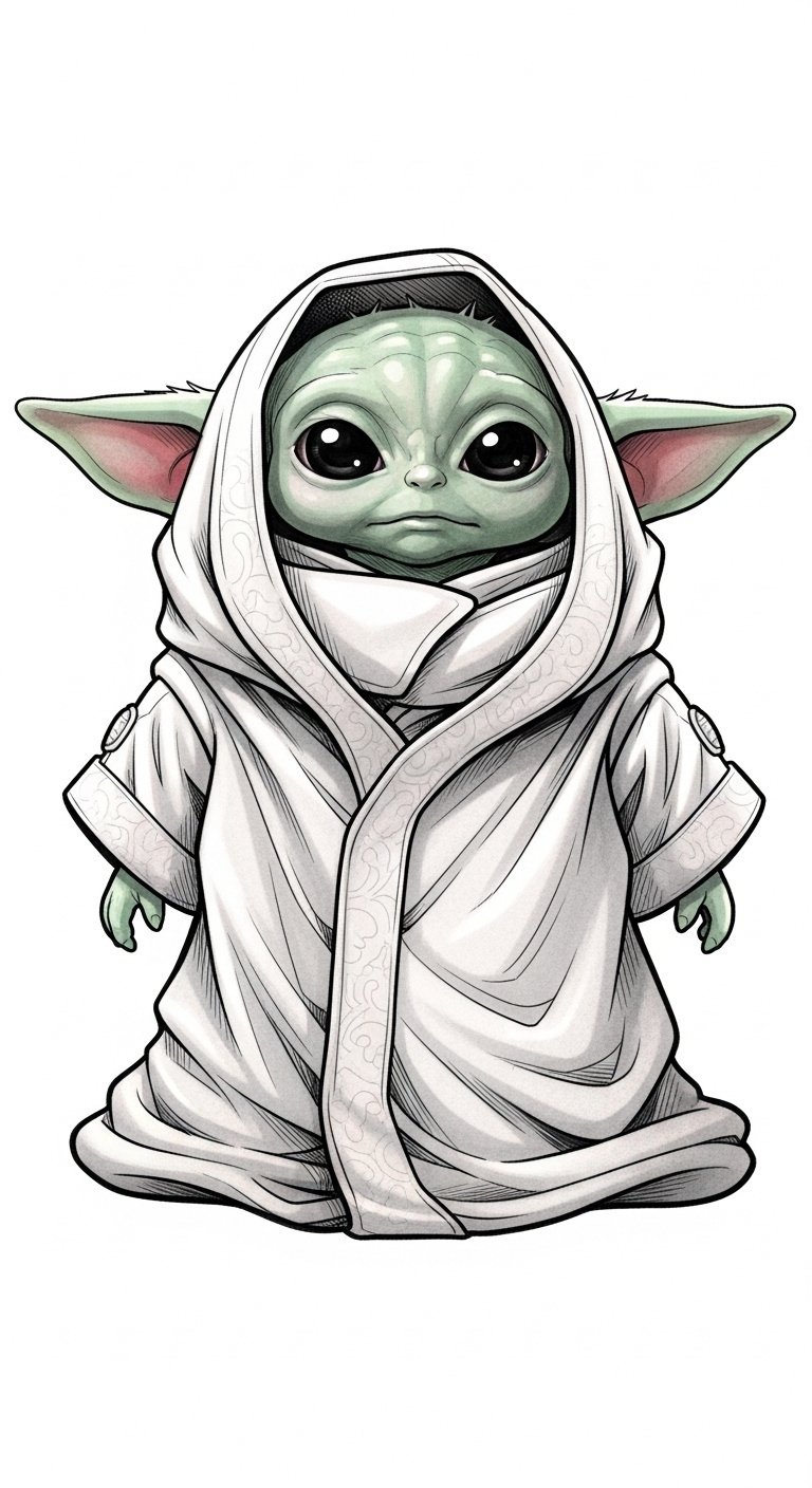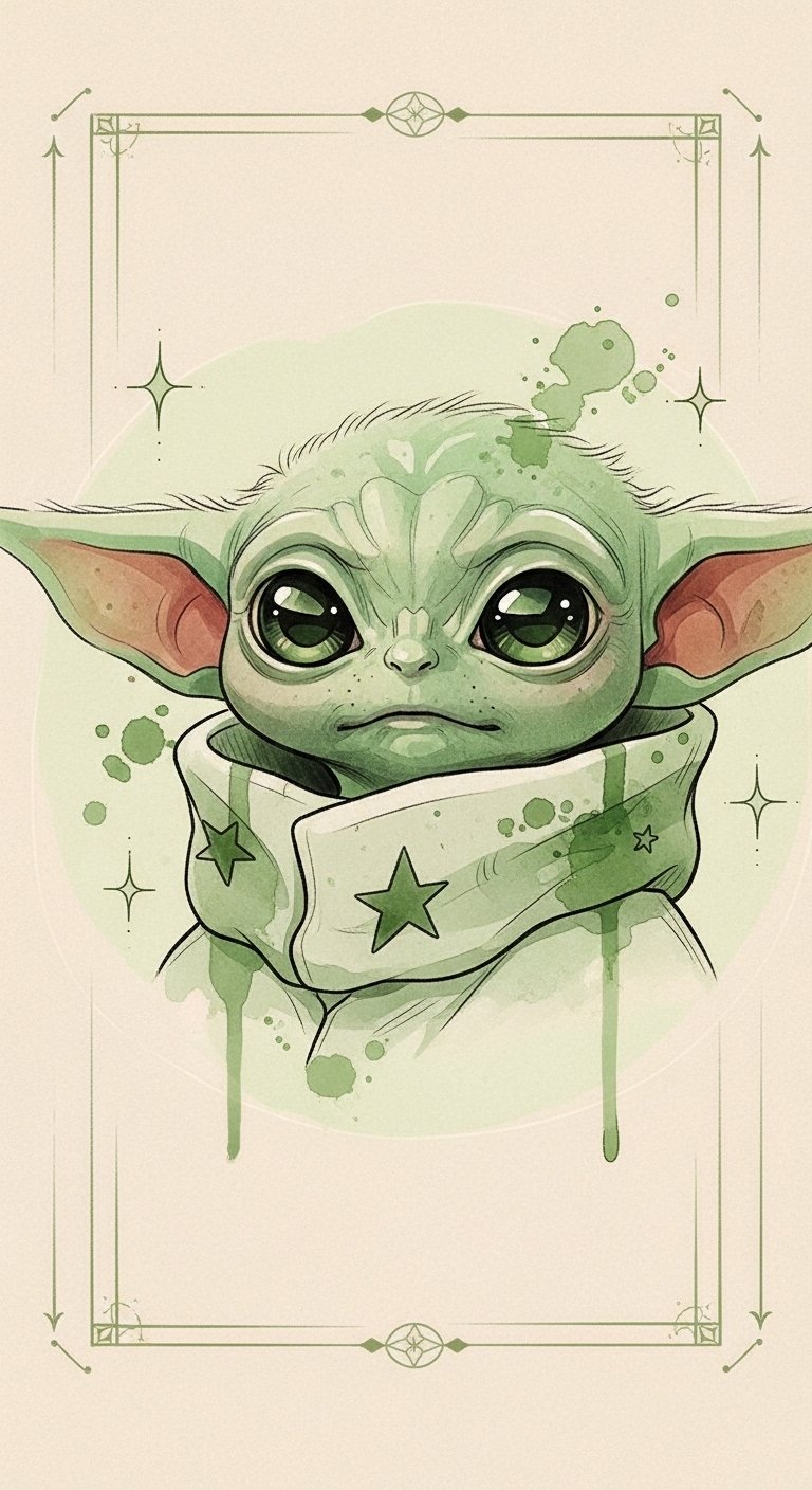 This design captures mischief and warmth through Baby Yoda’s joyful smile and impish pose, using soft lines and subtle shading to emphasize his big eyes and tiny gestures; symbolic elements — a small floating frog, a scattering of sparkles, and a tiny cloak fluttering — convey curiosity, playfulness, and a free spirit.