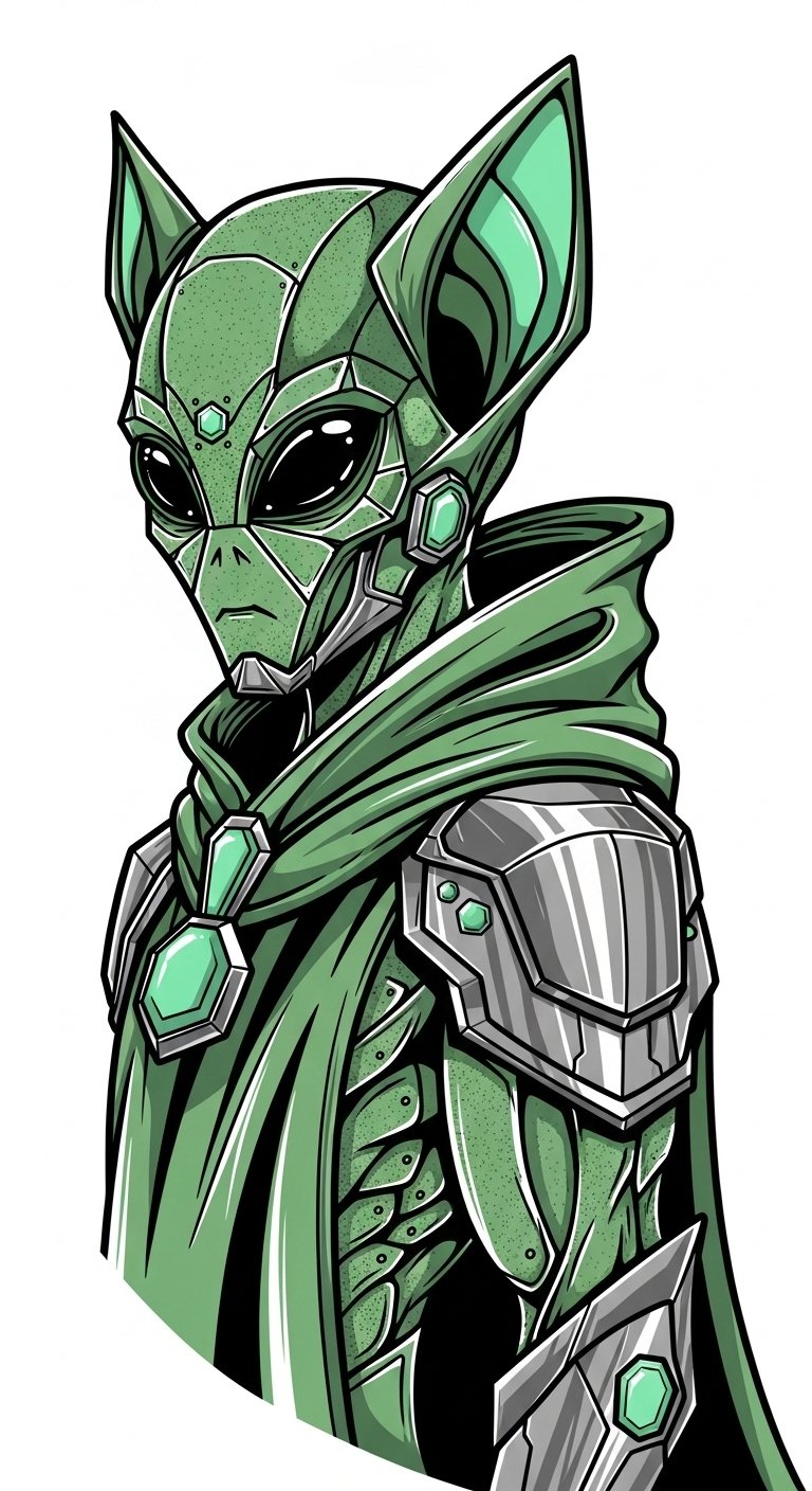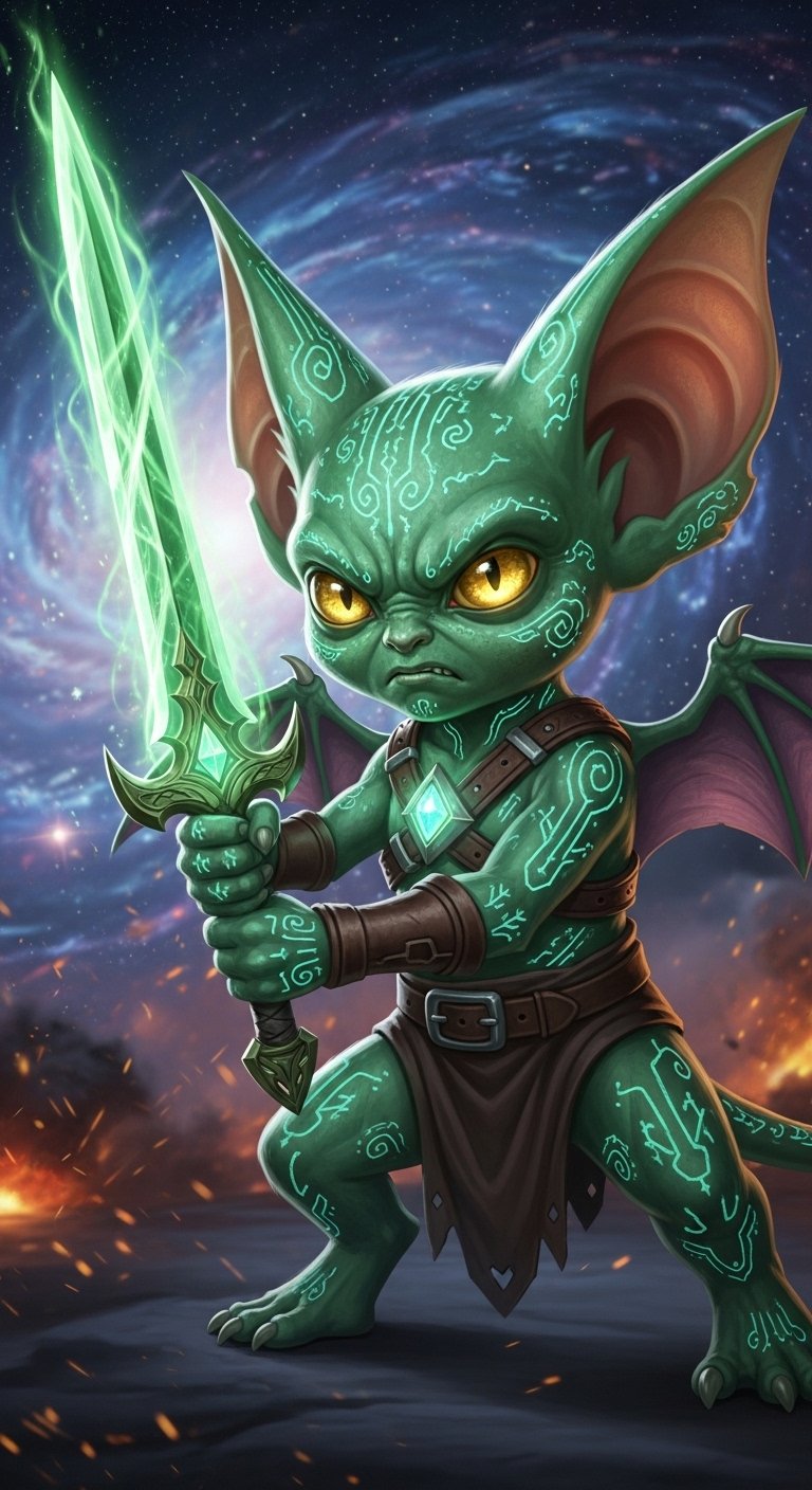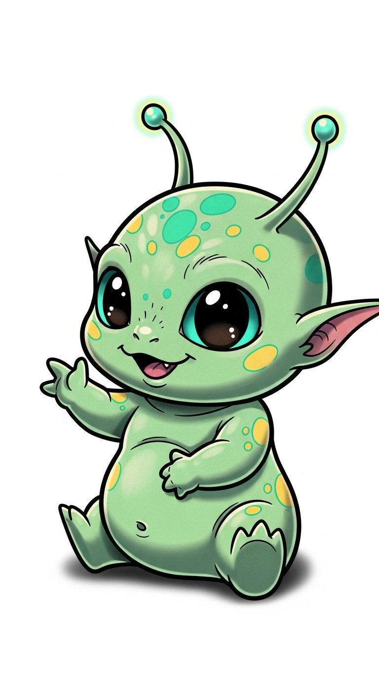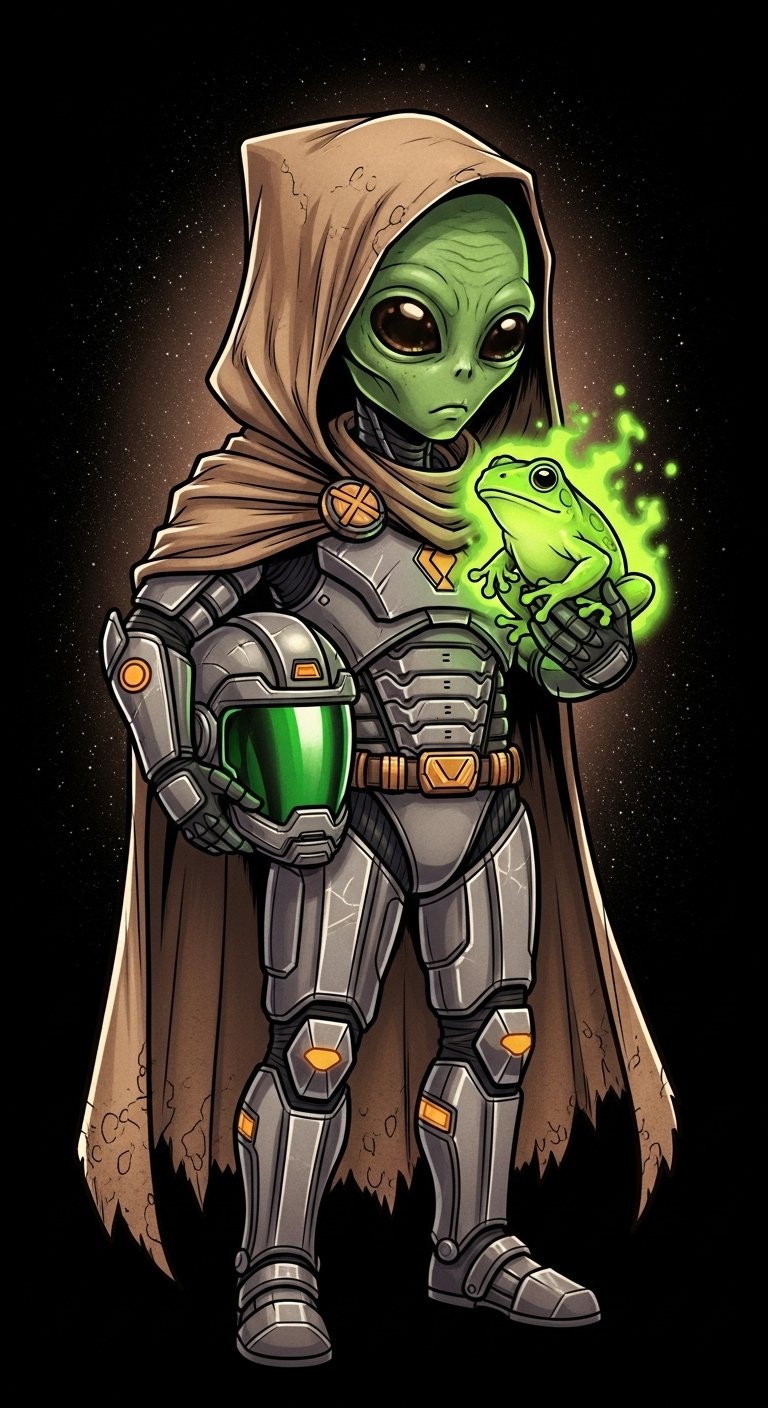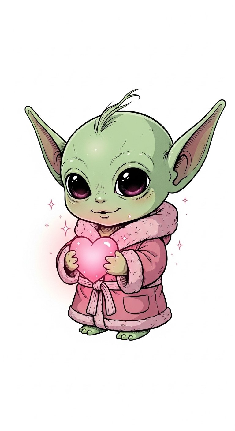 This design captures mischief and warmth through Baby Yoda’s joyful smile and impish pose, using soft lines and subtle shading to emphasize his big eyes and tiny gestures; symbolic elements — a small floating frog, a scattering of sparkles, and a tiny cloak fluttering — convey curiosity, playfulness, and a free spirit.