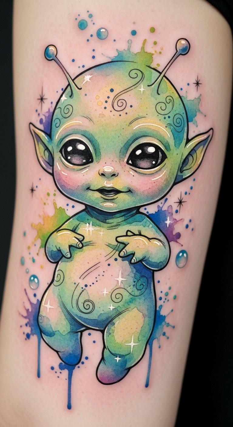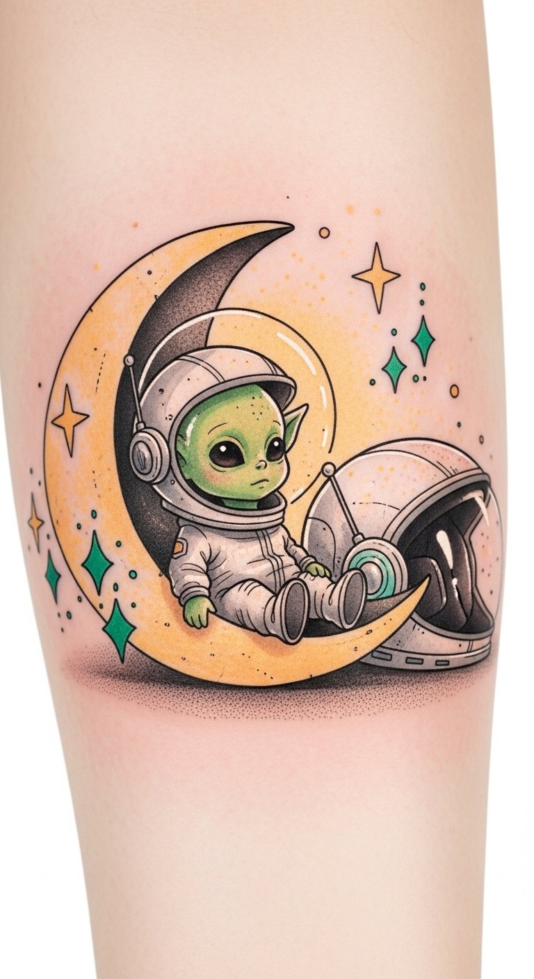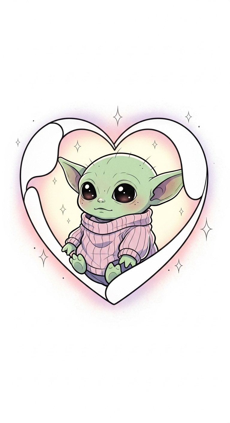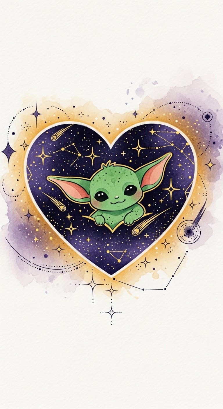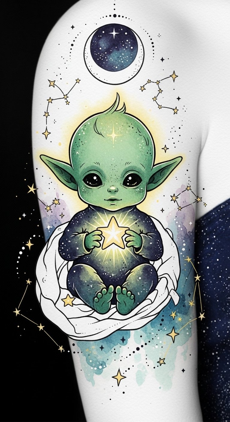 Imagine a cosmic Baby Yoda nestled within a heart of stars, radiating warmth and wonder, reminding you to embrace your inner light and freedom in every adventure. The design evokes comfort, playfulness, and a gentle reminder of curiosity; ideal placement is the inner forearm, upper shoulder, or over the heart where intimate meaning and visibility balance, rendered with soft color washes and crisp linework to preserve charm and detail.