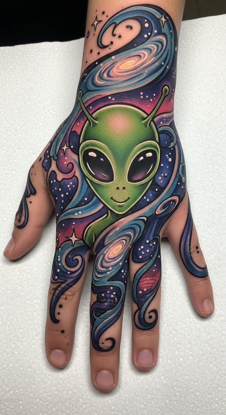 A colorful Baby Yoda hand tattoo channels whimsy and warmth, using bright greens, teals, and soft pastels to evoke playfulness and childlike wonder. Placed to wrap around the fingers, curve along the thumb, or sit centered on the palm, the design becomes interactive—moving with your hand to express freedom and spontaneity. Symbolically it represents curiosity, protection, and a lighthearted spirit; emotionally it lifts mood and invites smiles, making everyday gestures feel joyful and creative.
