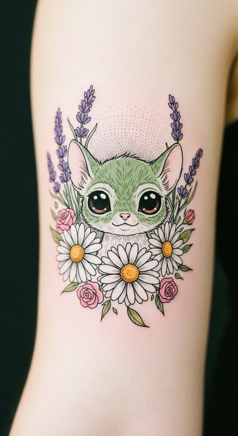 This design can flourish beautifully on your forearm or shoulder, allowing you to showcase your love for both nature and the galaxy’s cutest creature.
