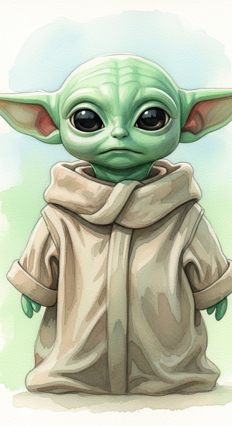 This design captures the original text’s celebration of Baby Yoda’s charm through watercolor techniques, using vibrant palettes that evoke emotion and imagination; the soft greens, blues, and yellows swirl to create a dreamy, whimsical effect that feels playful and free.