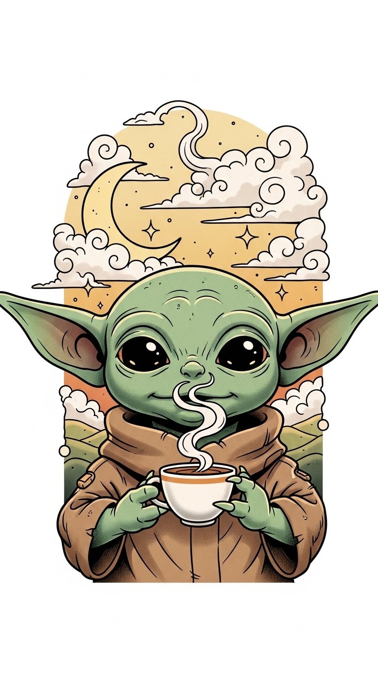 This design uses the original lines as visual guidance: Baby Yoda cradling a small steaming cup, eyes half-closed in contentment, oversized ears framing a gentle, rounded face; clean linework with soft shading for skin folds and fabric texture, warm muted greens and earth-toned robes, small highlights on the cup to suggest porcelain. Symbolically it represents comfort, childlike wonder, and quiet moments of joy; emotionally it evokes nostalgia and tenderness, making it suited for intimate placements like the inner forearm, ribcage, or ankle where the piece can be seen close-up and appreciated as a personal reminder of warmth and innocence.