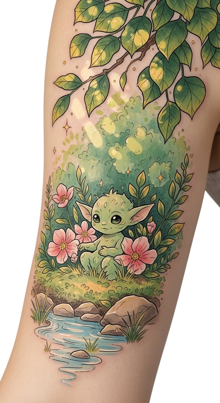 A Baby Yoda tattoo set in a serene nature scene captures the essence of harmony and tranquility that fans adore.