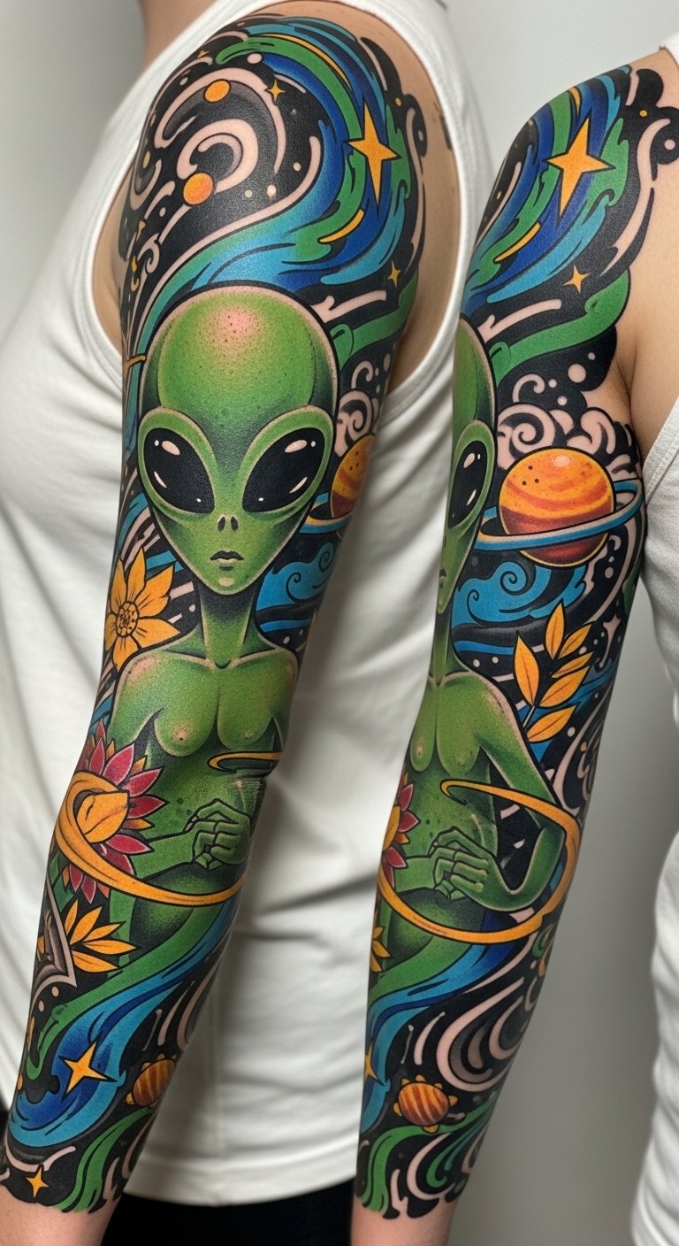 This design weaves vivid greens, blues, and yellows into flowing backgrounds and nebulous textures that frame Baby Yoda in several iconic poses, creating a cohesive sleeve that moves with the arm; symbolism centers on innocence, curiosity, and protection—Baby Yoda representing a gentle guardian and the swirling colors evoking growth, hope, and emotional depth.