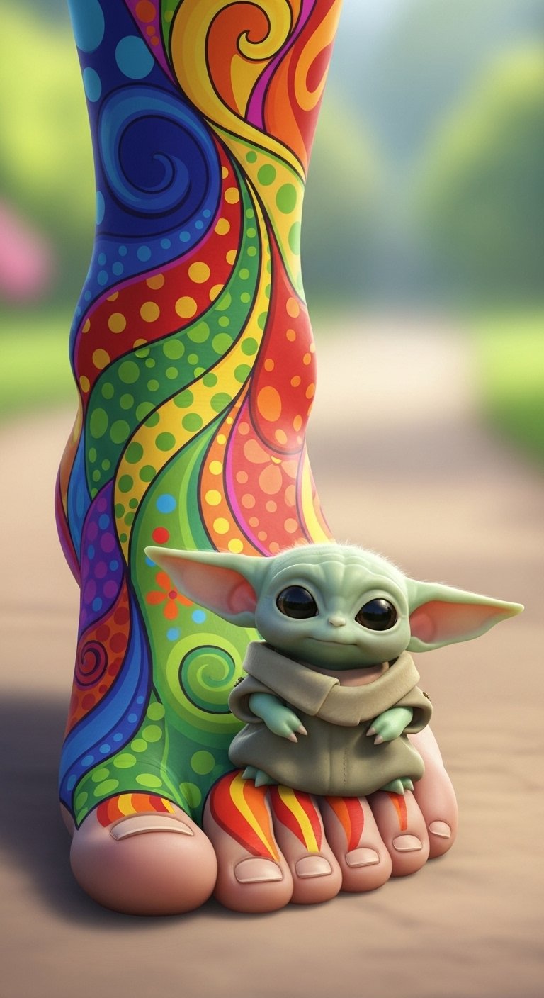 A Baby Yoda on the foot symbolizes innocence, curiosity, and the gentle strength found in small things; placing this playful figure where steps are taken speaks to carrying wonder and resilience with every movement.