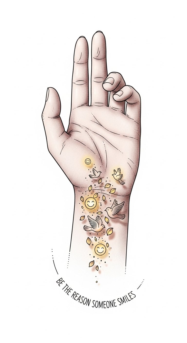 This tattoo concept symbolizes the transformation of a small act into widespread joy—the hand represents giving, the smile icons are immediate warmth, and their metamorphosis into birds and petals shows growth and freedom.