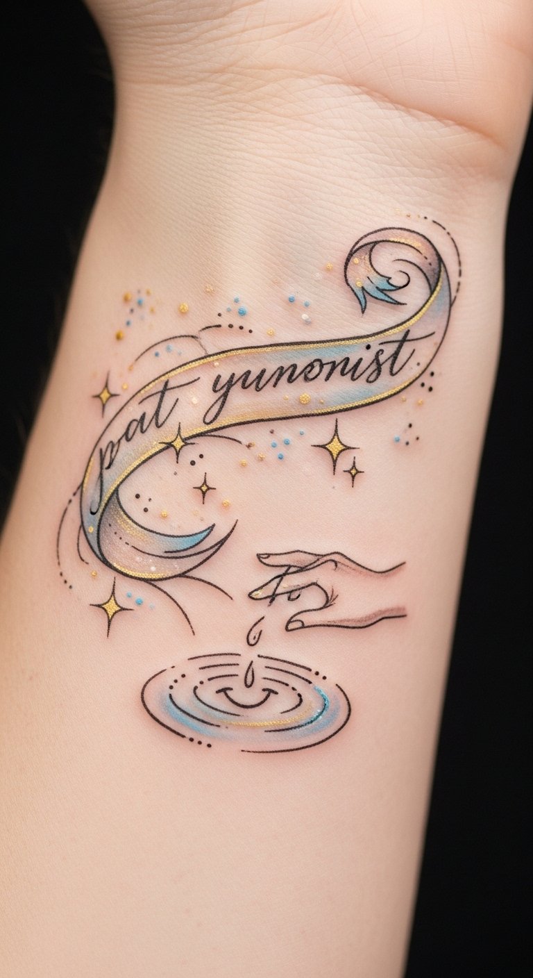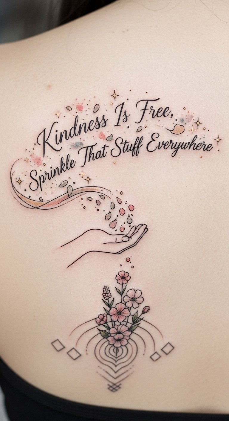 A flowing wrist or forearm tattoo combining delicate watercolor washes with fine-line script of a chosen quote, accompanied by a small open hand cradling a sprouting heart—symbolizing giving, growth, and gentle strength; the watercolor hues evoke warmth and hope, while the linework keeps the message clear and intimate, encouraging quiet conversations about compassion when shown or noticed in passing.