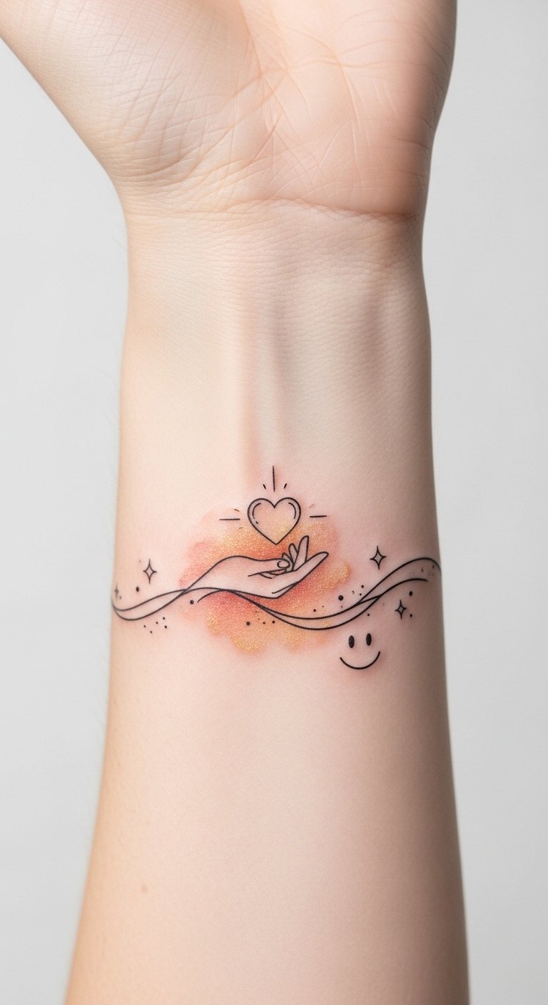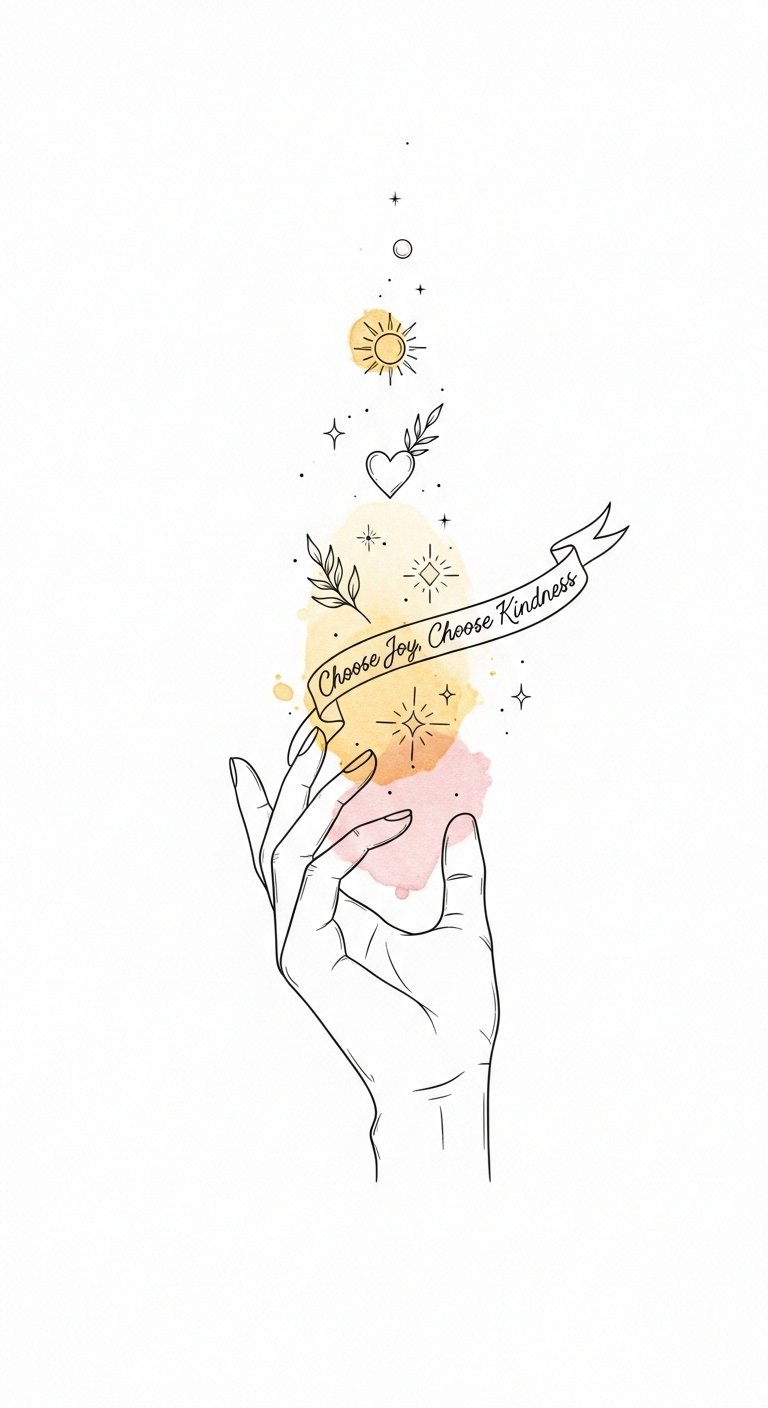A wrist or inner forearm placement lets the open hand feel personal and intentional, a quiet reminder you can see throughout the day. The hand releasing symbols represents active choice—joy (sun), love (heart), growth (sprig), and presence (glow)—radiating outward to uplift others. Warm watercolor tones evoke positivity and gratitude without overwhelming the fine-line design, while the tiny stars suggest inspiration and the thin ribbon text ties the concept together as a gentle mantra. The piece aims to feel compassionate, hopeful, and uplifting.