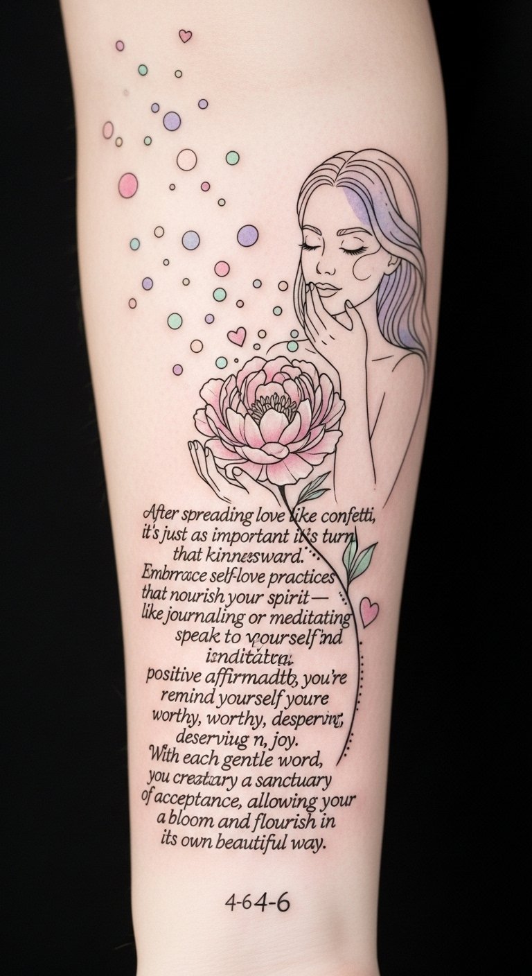 Pastel washes lend gentle warmth and optimism while fine-line work keeps the piece intimate and timeless. Ideal placement is the inner forearm for visibility and personal reminder, or the collarbone for a discreet, elegant statement; the overall emotion evokes calm encouragement and a quiet commitment to kindness.