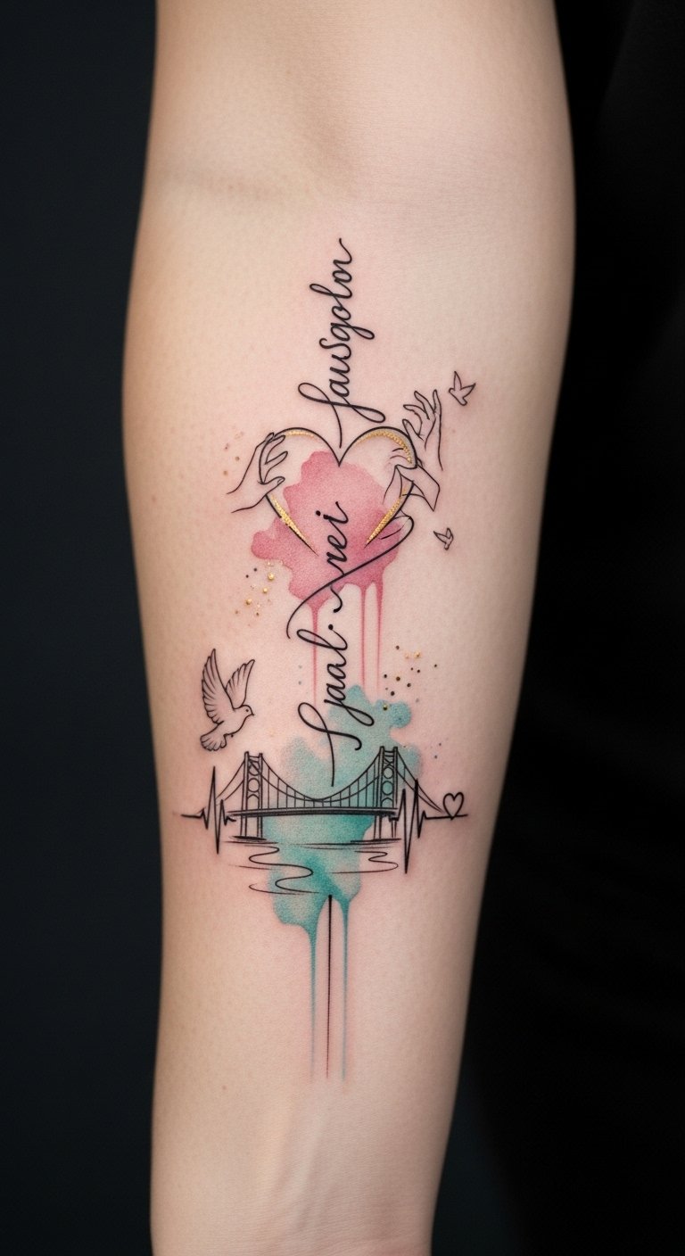 Watercolor tones add warmth and hope, while fine-line details keep it intimate and wearable. Ideal placement is inner forearm or ribcage for a personal reminder, or across the shoulder blade to convey outreach; size can be adjusted so the script remains legible and the transformative elements retain their delicate motion.