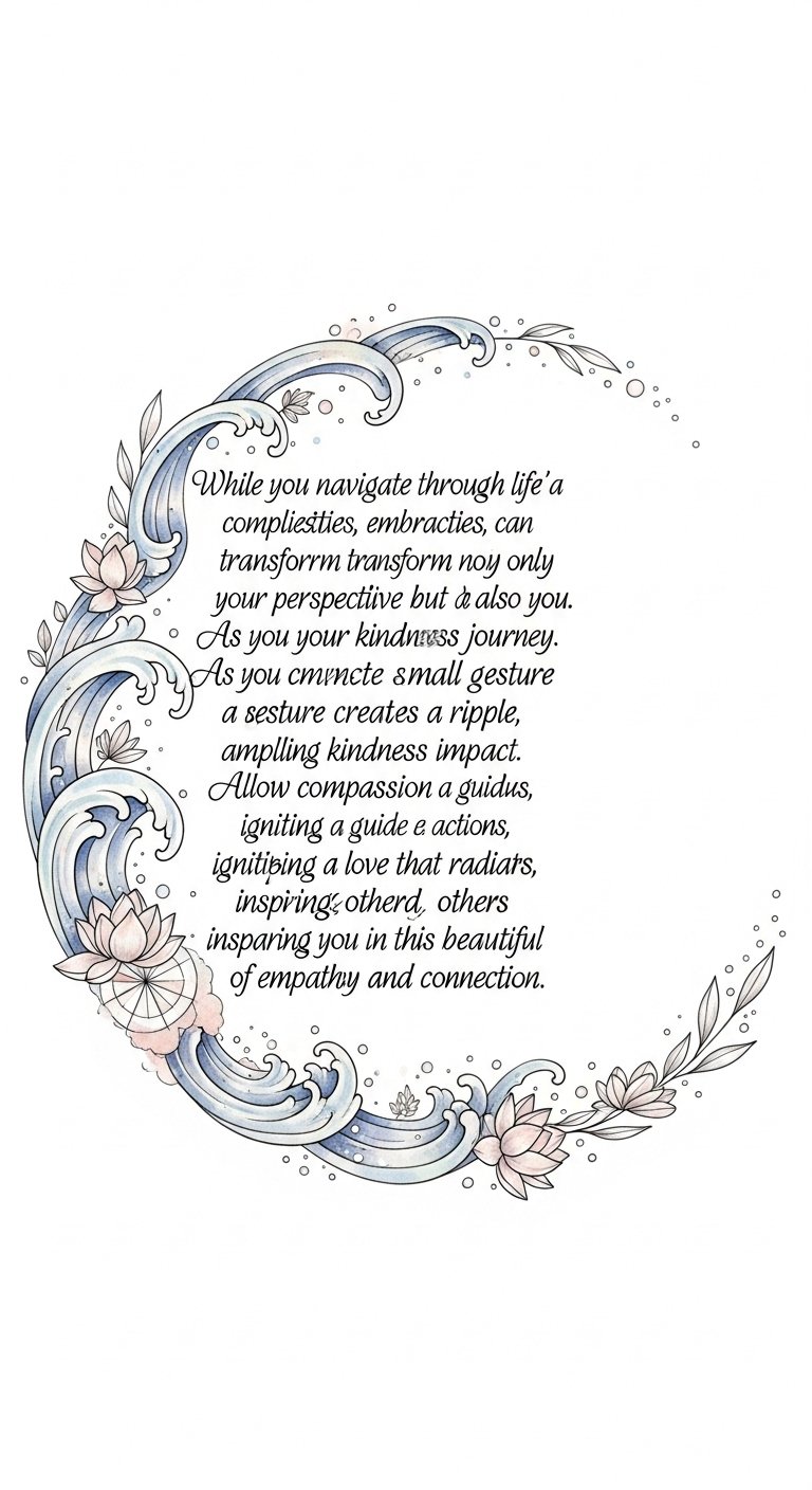 The design places the full untouched text along a gentle crescent of watercolor waves, the script integrated with rippling circle motifs to visually represent how small gestures spread outward; lotus blooms symbolize purity and renewal, while the faint compass rose evokes guidance through life’s complexities.