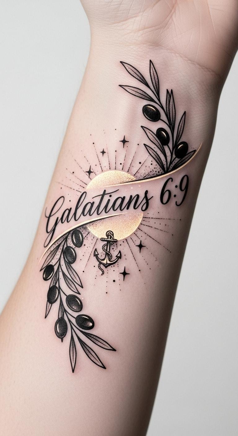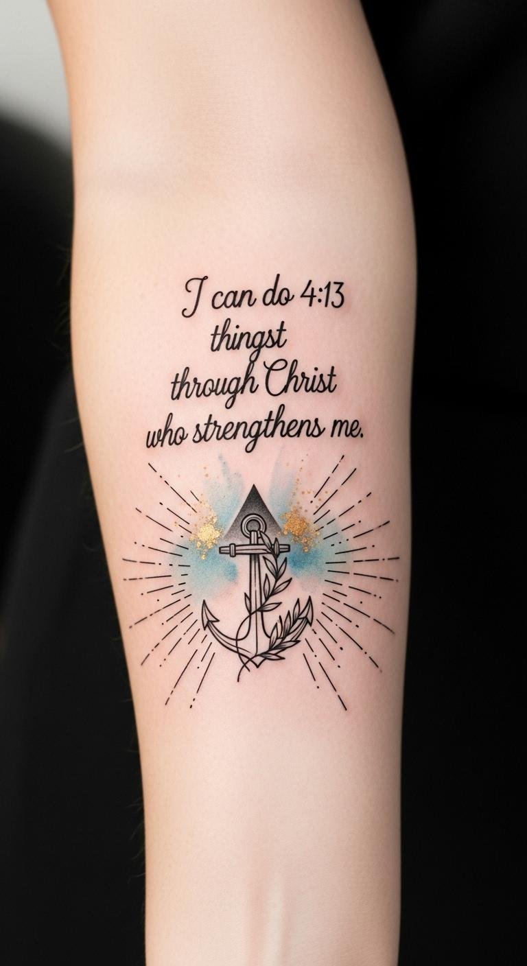 This design pairs the exact verse in graceful script with an anchor symbolizing steadiness and faith, the olive branch for peace and covenant, and watercolor bursts and rays to convey inner strength and divine light; it evokes reassurance and courage, suitable for inner forearm, ribcage, or shoulder placement where the wearer can both see and share the message.
