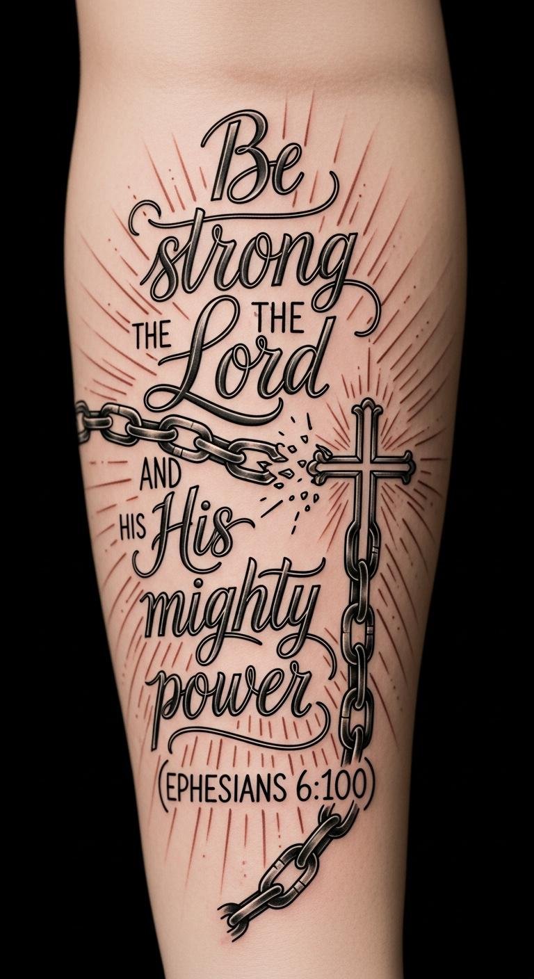 Embracing the strength found in Ephesians 6:10, “Be strong in the Lord and in His mighty power,” inspires you to draw from a source greater than yourself. This scripture meaning embodies spiritual strength, making it a powerful tattoo symbolism. Consider its placement significance as a resilience reminder, allowing your personal faith to shine through artistic choices that express your empowerment message and faith expression.