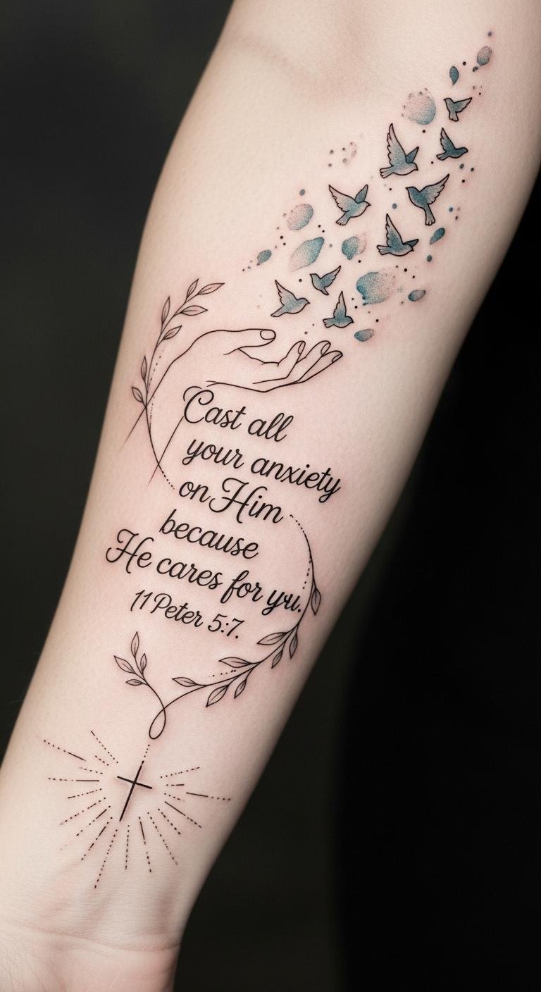 An intimate forearm placement emphasizes visibility and frequent personal reminder; the open hand and birds symbolize release and surrender. The watercolor washes convey peace and emotional healing, the cross anchors spiritual care, and the vines suggest growth after letting go.