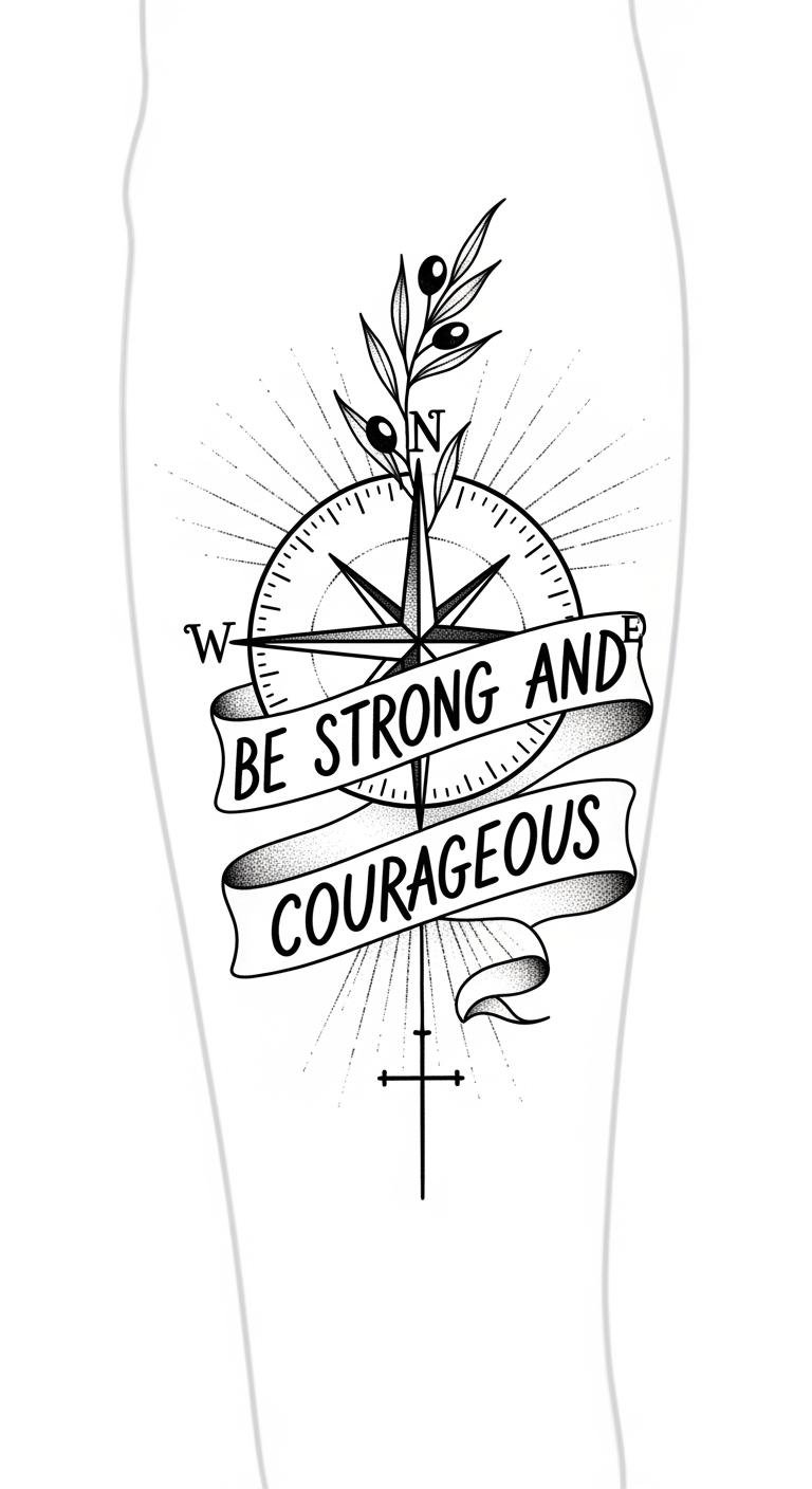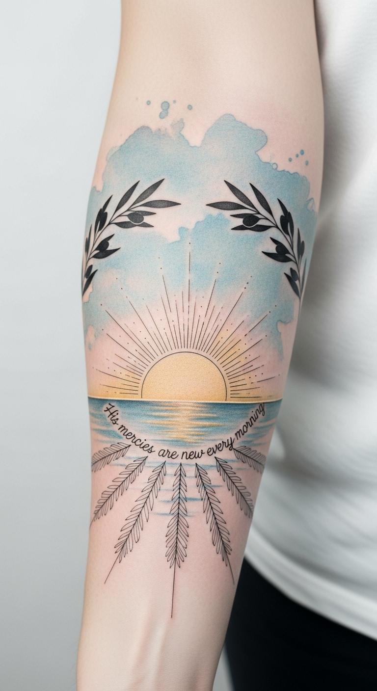 Place this design along the inner forearm where the flowing script can follow the natural line of the arm; the compass symbolizes divine guidance and direction, the olive branches represent peace and covenant, the sunrise watercolor suggests hope and a new future, and the dotted path evokes a personal journey.