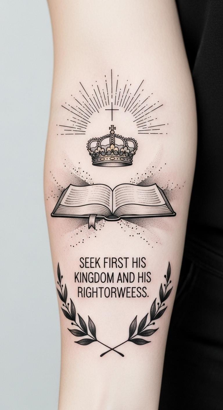 Laurel vines suggest victory and spiritual growth; dotwork and limited gold accent add reverence without ostentation. Emotionally the piece aims for quiet devotion and daily encouragement, making the wearer feel grounded and purpose-driven.