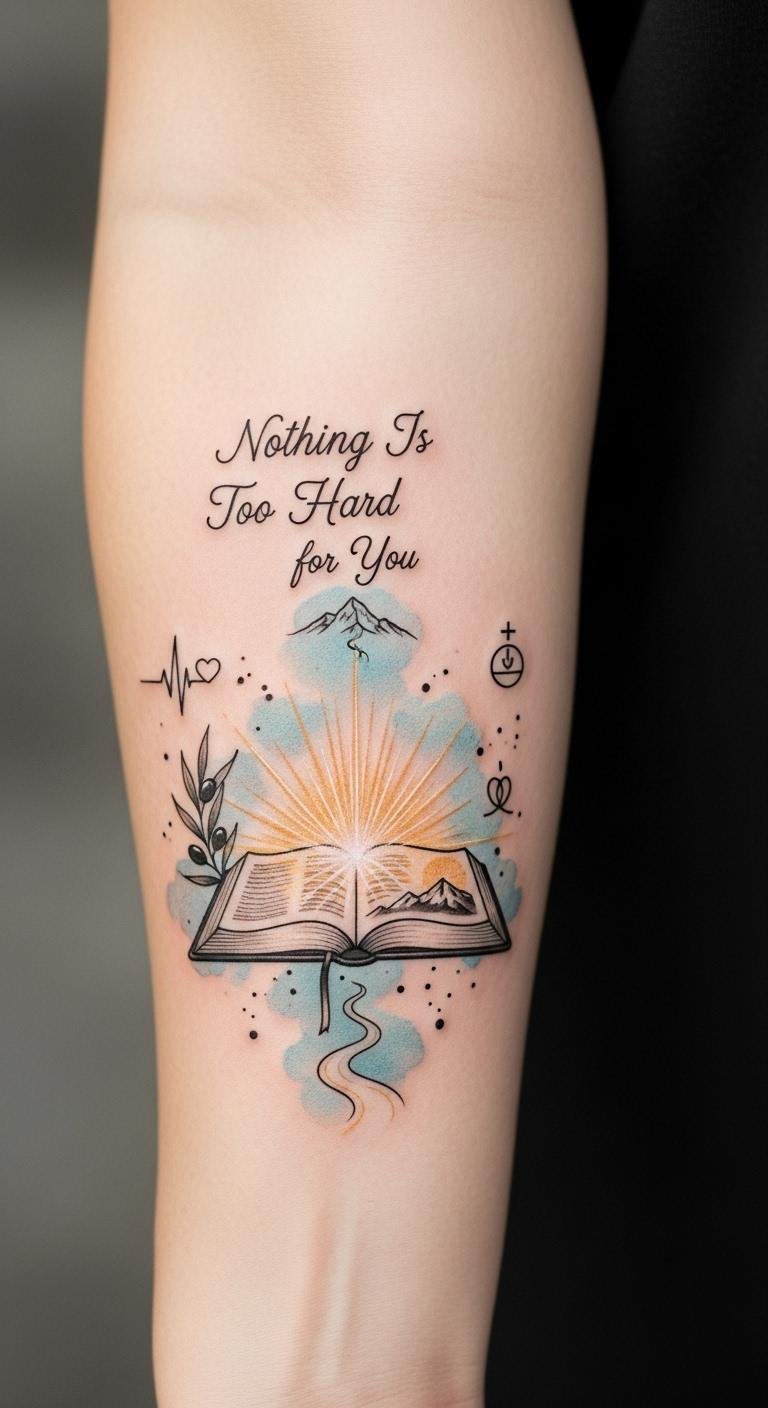 Embrace this hope symbolism in a tattoo design that reflects your faith journey, personal testimony, and spiritual strength as you overcome obstacles through divine guidance and emotional healing. The open Bible and bursting light symbolize revelation and God’s active presence; the heartbeat line represents life renewed, the olive branch signifies peace and reconciliation, and the winding path toward the mountain embodies perseverance and the ascent toward spiritual milestones.
