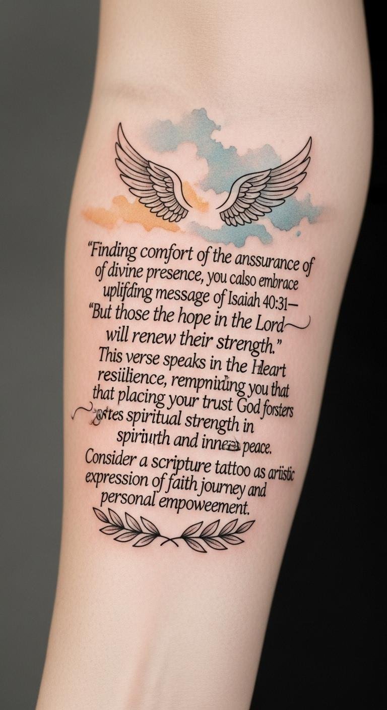 When you think about the power of faith, have you considered how a simple tattoo can embody your spiritual journey? Each verse can serve as a daily reminder of your strength and resilience. Imagine carrying the wisdom of Philippians 4:13 or Jeremiah 29:11 with you always. These tattoos not only express your beliefs but also inspire you in challenging moments. Let’s explore how these meaningful designs can transform your outlook and reinforce your spiritual identity. The open Bible symbolizes ongoing faith and learning, the laurel vines signify victory and perseverance, and the cross charm anchors the piece in personal devotion; placed on the inner wrist it offers intimate visibility for moments of reflection while remaining easily covered, evoking calm assurance and quiet empowerment.