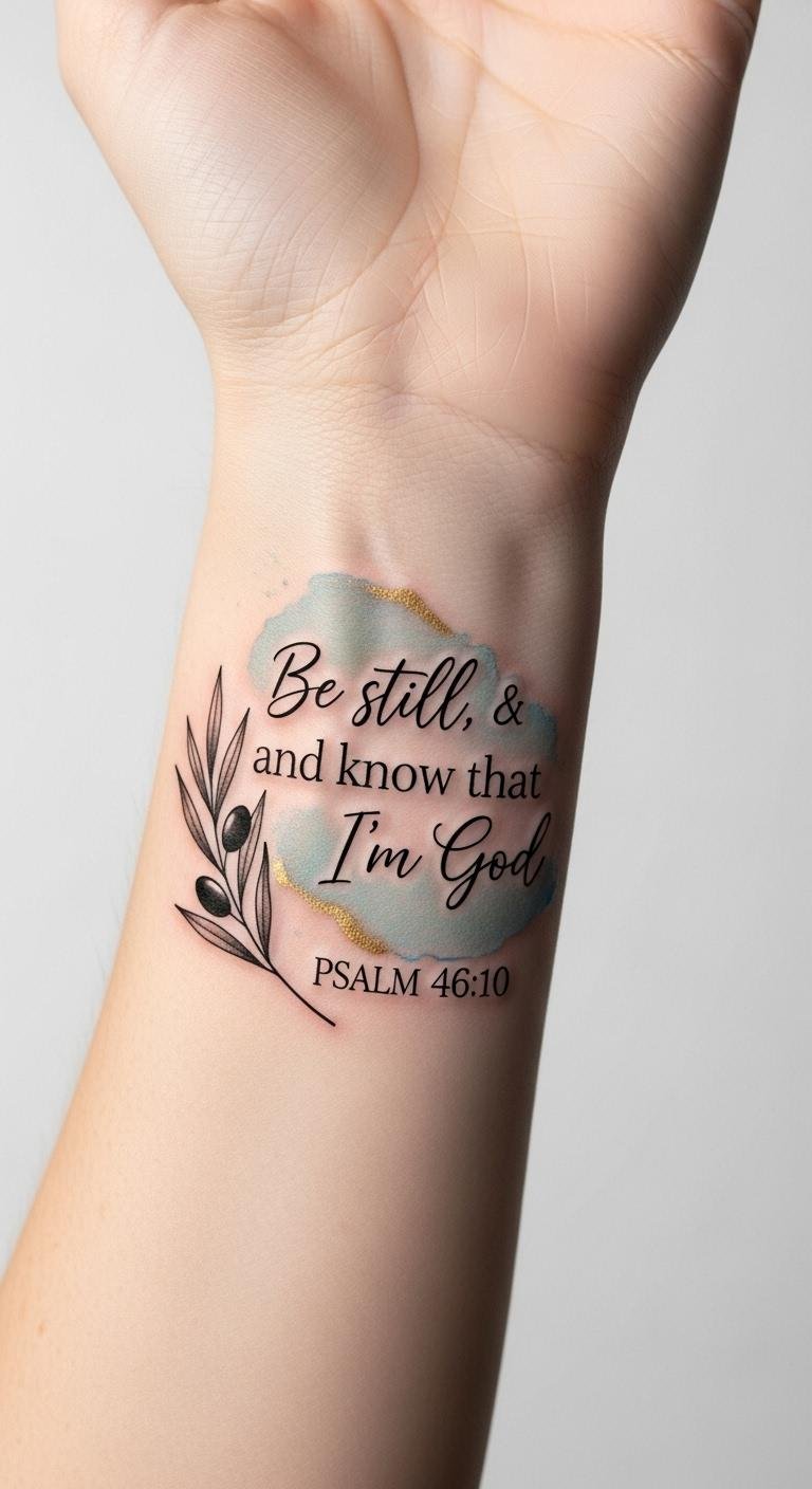 A tattoo design featuring this scripture can symbolize inner strength and personal faith, making impactful placement choices that reflect its spiritual significance and cultural impact. The wrist location keeps the message intimate and visible for daily grounding; the olive branch evokes peace and reconciliation, while the soft watercolor behind the text adds emotional warmth without overpowering the scripture, inviting quiet contemplation whenever seen.