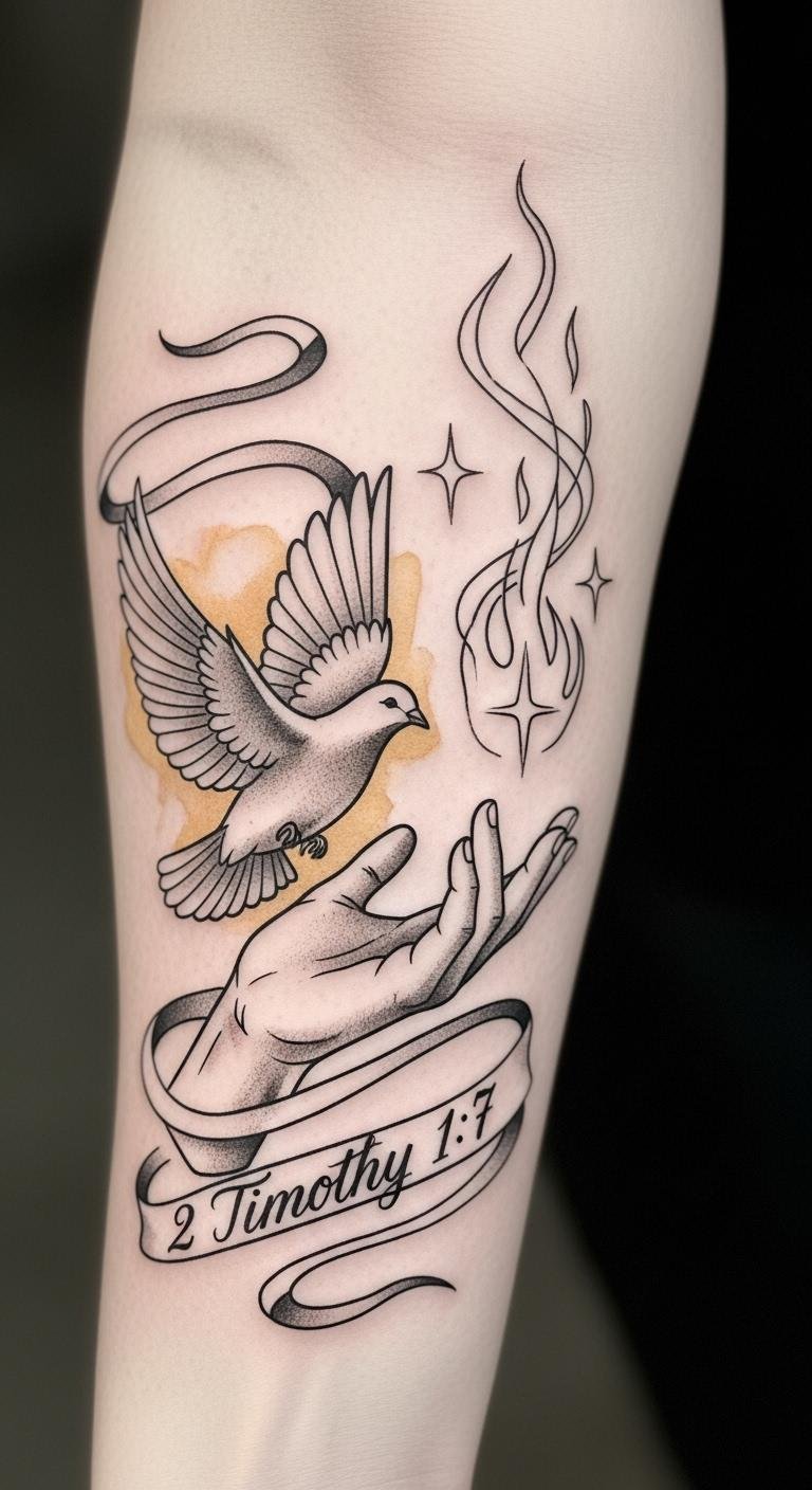 This design uses the open hand to symbolize receiving God’s spirit, the dove for peace and love, and the flame for power and courage; the ribboned scripture ties the symbols to the verse, while the soft gold wash suggests warmth and hope.