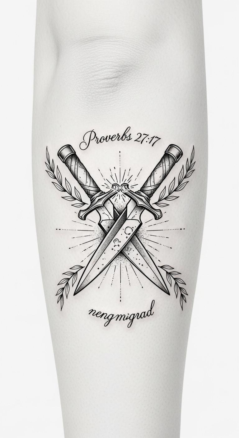 Place the tattoo on the inner forearm for daily visibility and personal reminder, or on the upper back between the shoulder blades as a subtle emblem of shared strength; the laurel and sparks symbolize growth and transformative energy, while the clean blades evoke sharpening, resilience, and reciprocated refinement.
