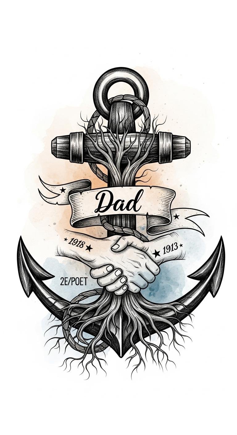 This concept uses the anchor to symbolize stability and protection, the ribbon and script to personalize memory and identity, and the roots-to-hands transition to convey lineage and supportive touch; emotionally it balances strength and tenderness, and it sits well on the upper forearm or over the heart where the wearer can both protect and display the tribute.