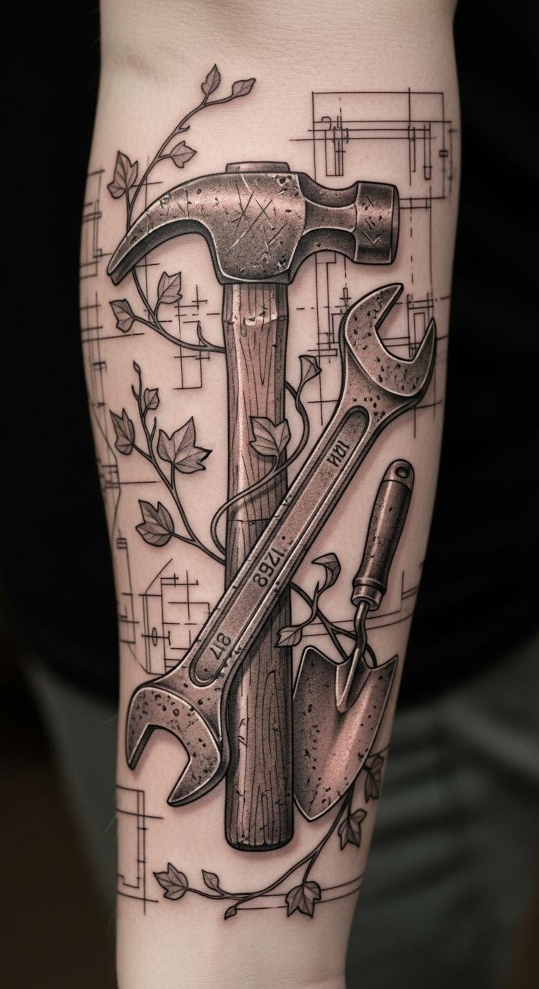 Craftsmanship tattoos featuring hammers, wrenches, or trowels serve as powerful passion representations and trade tributes, celebrating his labor of love and unwavering craft dedication through meaningful tool symbolism that resonates deeply with your shared memories.