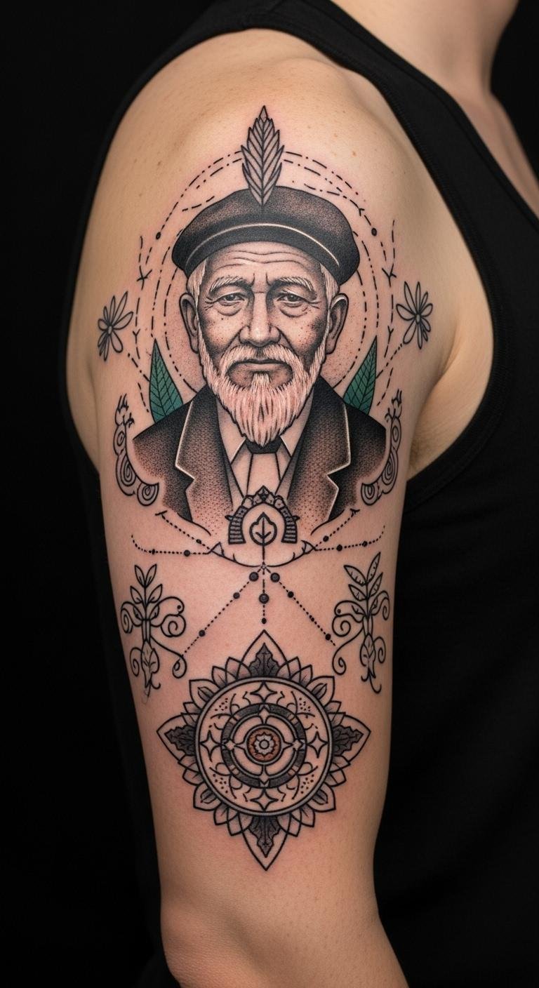 A flowing half-sleeve design that layers a central ancestral portrait silhouette with interwoven cultural motifs—woven patterns, traditional floral elements, and a subtle family tree whose roots morph into script-like symbols from your heritage—rendered in fine-line black ink with selective soft color accents; ideal placement on the upper arm wrapping toward the shoulder and chest to evoke continuity, symbolizing reverence for lineage, emotional grounding in shared memory, and a visible yet intimate statement of identity and generational connection.