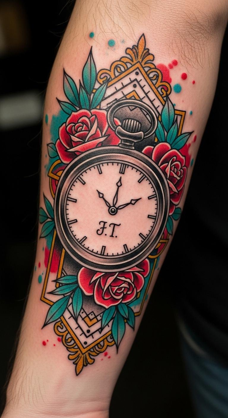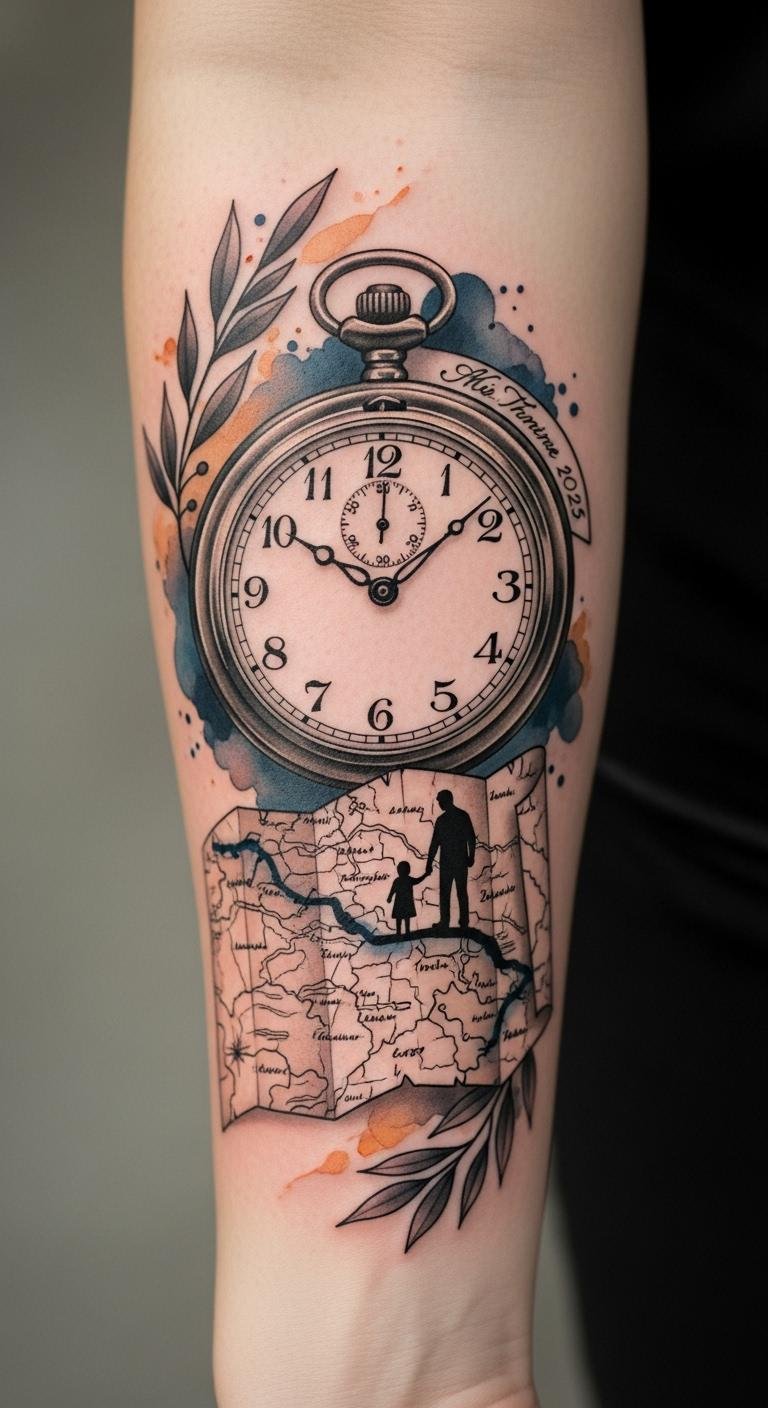 This inked tribute becomes a canvas of timeless reminders, celebrating your bond and the unbreakable connection that transcends time, forever etched on your skin. Place along the inner forearm or over the heart for intimate visibility; the watch face and initials sit where you can glance easily, while the surrounding watercolor and silhouettes carry emotional depth and movement.